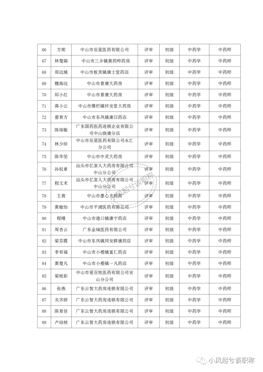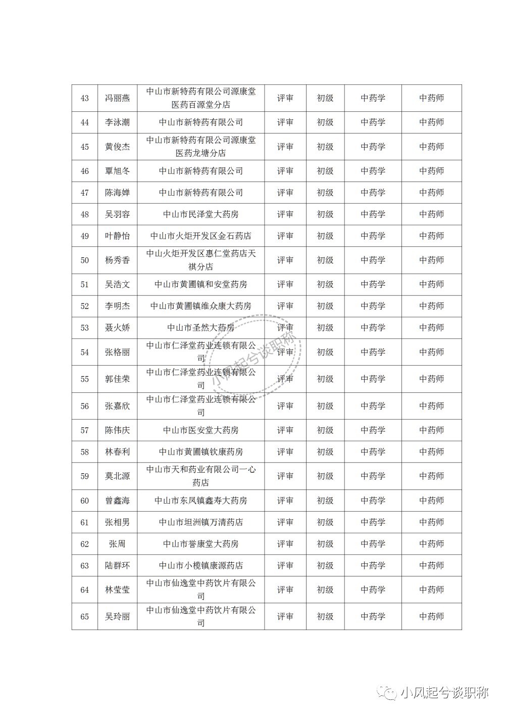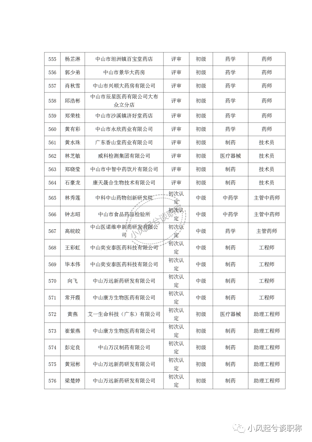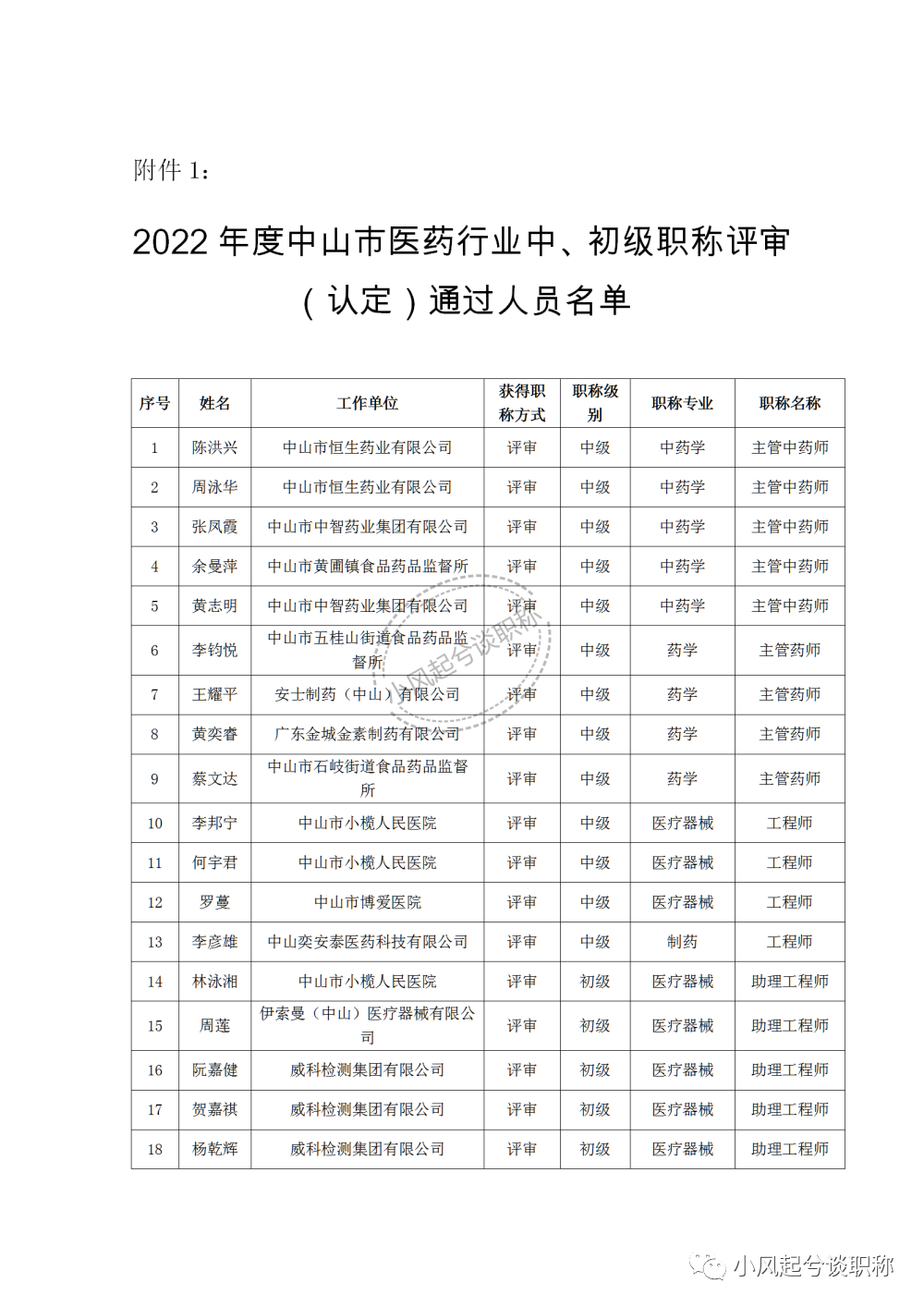 1、2022年度中山市医药行业中、初级职称评审(认定)通过人员名单