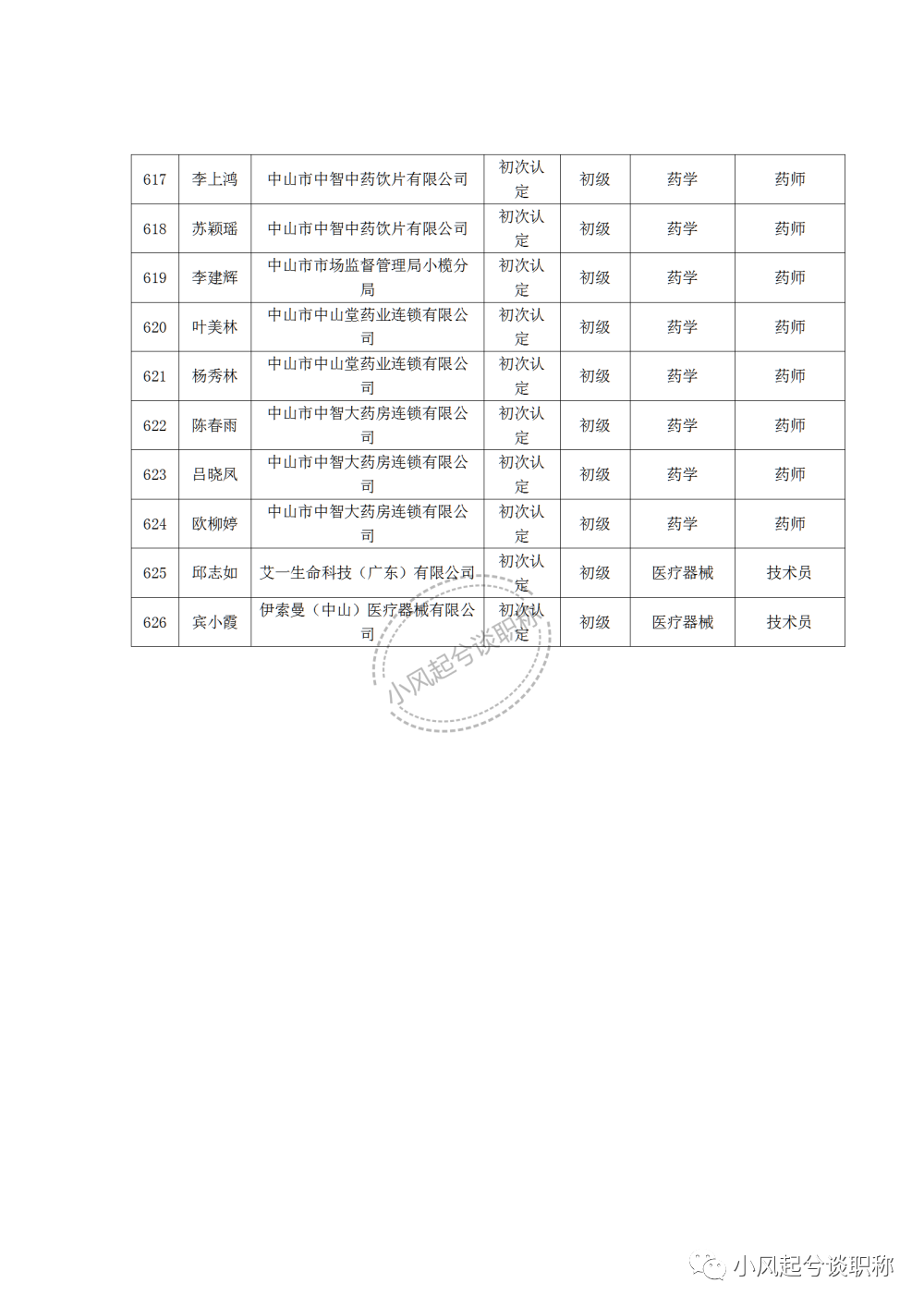 2022年度中山市医药行业中、初级职称评审(认定)通过人员的公示