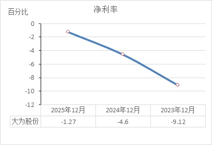 趋势明显好转:从-9.12%到-1.27%,连续三年大幅收窄,说明亏钱的速度确实在减慢,这是唯一值得安慰的。