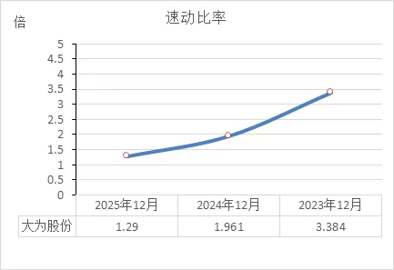 2025年(1.29倍):跌到警戒线附近。虽然还在1倍以上(1.29元还1元),但比2024年大幅下滑。原因是现金烧掉2个亿,应收款也少了,能马上还债的钱大幅缩水。
