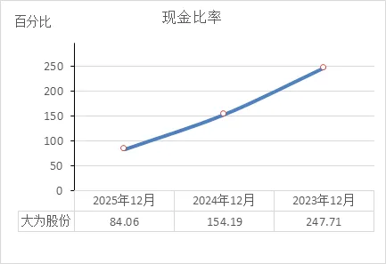 比流动/速动比率更残酷:流动比率3.02(看着还行)、速动比率1.29(及格)、现金比率84%(快不行了)。这三个数越来越低,说明流动性是靠卖不掉的库存(存货)和没收回的款(应收)撑着的,真正的现金已经不多了。