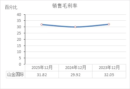 非常稳定:32.05% → 29.92% → 31.82%。三年波动幅度只有2个多点,说明生意模式很成熟,赚钱的底子很扎实。不管是金价涨跌,还是成本波动,它都能把毛利控制在这个水平。