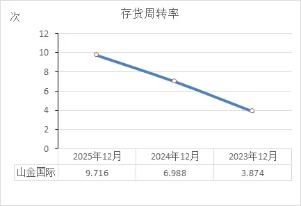 持续加速:3.874次 → 6.988次 → 9.716次。三年涨了1.5倍。2023年库存卖光一次需要约94天(365/3.874),到2025年只需要约38天(365/9.716)。货在仓库里停留的时间越来越短。