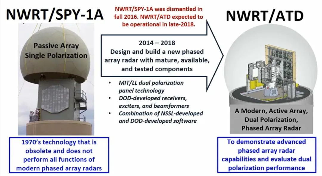 NOAA的国家天气雷达试验台(NWRT)的SPY-1A(2003-2016) 是前期核心验证平台,为单极化无源阵列雷达,核心成果: