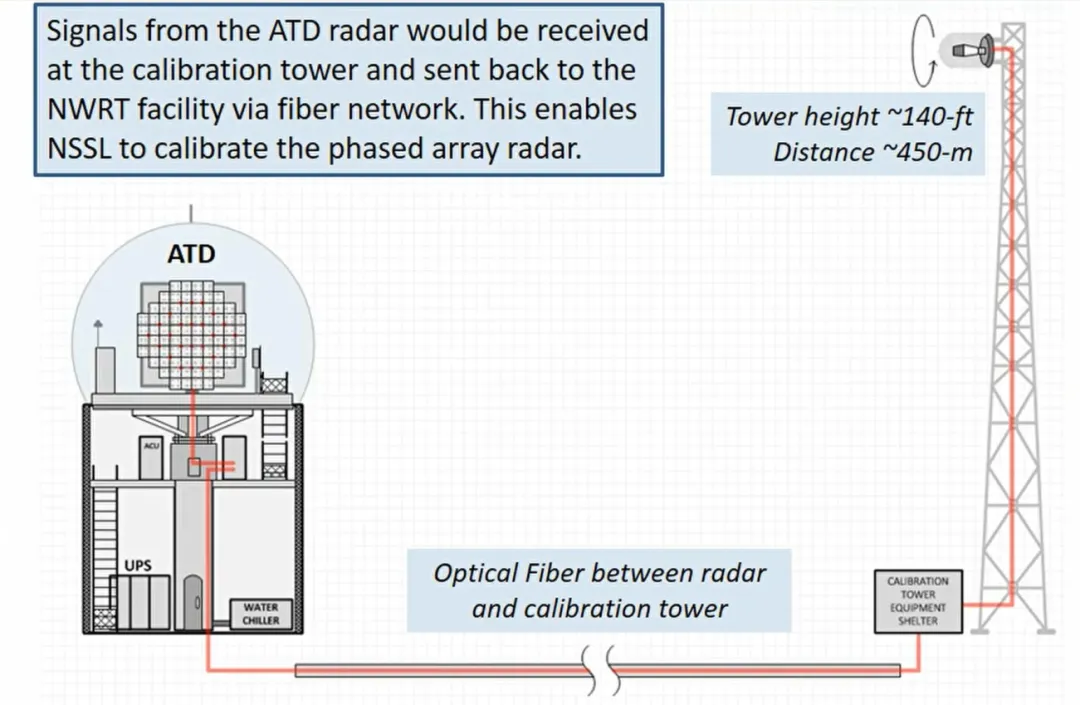 雷达校准塔,高度约140英尺,与雷达间距约450米,通过光纤网络实现雷达信号的接收与回传,完成PAR的校准工作。