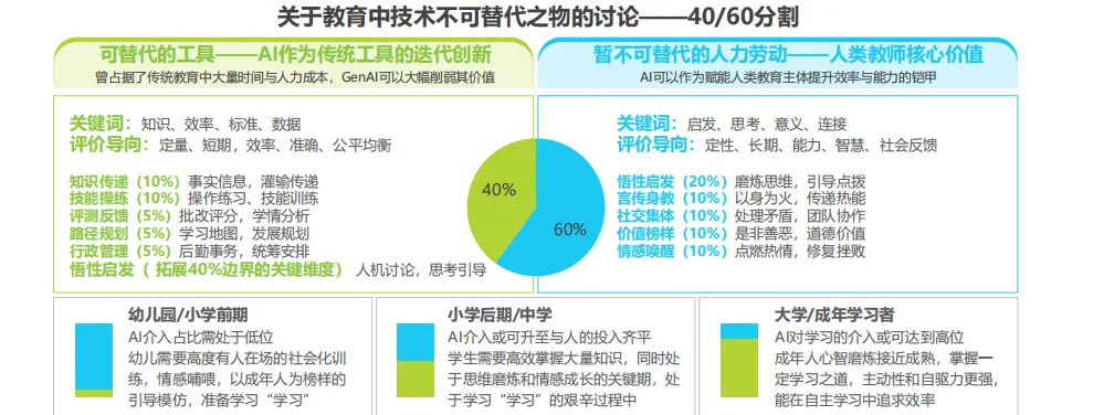 关于教育中技术的不可替代之物是一个长期、宏大且充满争议的研究课题,教育学者与分析师从未停止思考技术边界的问题。我们将教育分工这一复杂的社会活动,按照GenAI可不可以产生明显替代作用,用一个简单的饼图来呈现技术与人力劳动的分工模型供大家思考和讨论:40%是GenAI可替代的工具侧,即显性的可逻辑化、重复化的教育工具的迭代;60%是GenAI暂时难以涉猎的人类教育劳动投入,而GenAI的作用则是成为教育主体提升效率和能力的外挂。