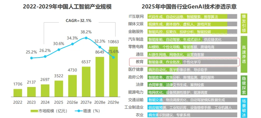 2025年是中国人工智能产业从技术爆发转向全面应用的关键一年。年初DeepSeek通过架构创新实现了模型的高效低成本运行,显著降低了技术应用的门槛,推动了GenAI在全行业的快速落地。受技术进步与应用普及的共同驱动,艾瑞测算2025至2029年中国AI产业将保持32.1%的年均复合增长率 ,在2029年突破1万亿的市场规模。在判别式AI时代,相比于互联网、金融、零售等行业人工智能技术的深度应用,教育行业属于技术渗透较浅较难的地带。而GenAI凭借强语言交互特性,精准契合了教育作为沟通密集型行业的本质,突破了渗透瓶颈。这种技术与场景的深度共振,使得教育行业迅速跃升为GenAI技术快速渗透并落地的主要战场之一。