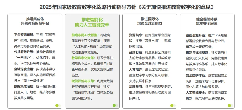 2025年是中国智慧教育元年,国家高度重视人工智能对教育的深刻影响,教育部等九部门联合印发了《关于加快推进教育数字化的意见》,作为未来几年教育数字化转型的纲领性文件,将人工智能技术被视为破解教育个性化、高质量、大规模融合难题的核心路径:通过国家平台的一体化集成与数据治理夯实底座,以GenAI深度赋能教学模式变革、科研范式转型与因材施教,在保障安全可信与自主可控的前提下,通过跨部门协同联动与多元投入机制,构建泛在可及的终身教育体系,并最终实现中国数字教育标准与品牌的全球化输出。