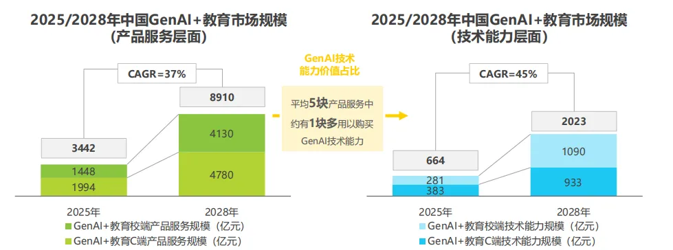 2025年GenAI在教育行业的快速渗透直观体现在了采购需求上:C端市场从2023年开始体验技术红利,学校端则是从2025下半年开始展现强劲的需求势头。2025年GenAI+产品服务总规模预计达3442亿元水平,预计将以37%的年复合增长率驱动2028年规模迈向8910亿水平;其中纯粹的技术能力价值增长更为迅猛(CAGR 45%),自2025年的664亿水平上升至2028年的2023亿元水平。无论在产品服务还是技术能力层面,学校端需求的复合增长率均高于C端市场,对整体GenAI+教育的规模增长起到明显带动作用。