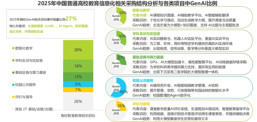 基于本次定量分析的普通高校有效标书样本,普通高校教育信息化相关采购中,TOP3类型为数智化教学、学科实训与实验室、基础设施与算力基座;其中在所有采购需求中,明确涉及GenAI的采购项目数量占比约27%,其中校园公共服务类项目需求中GenAI含量最高,院校要求技术有效提升管理、安防、行政报销等校园运转的智能化水平;其次是数智化教学领域,GenAI被寄希望于为教师减负增效,实现个性化学习路径、自动生成教学大纲,并提升课堂互动质量。