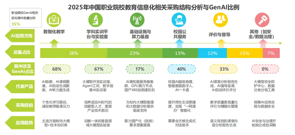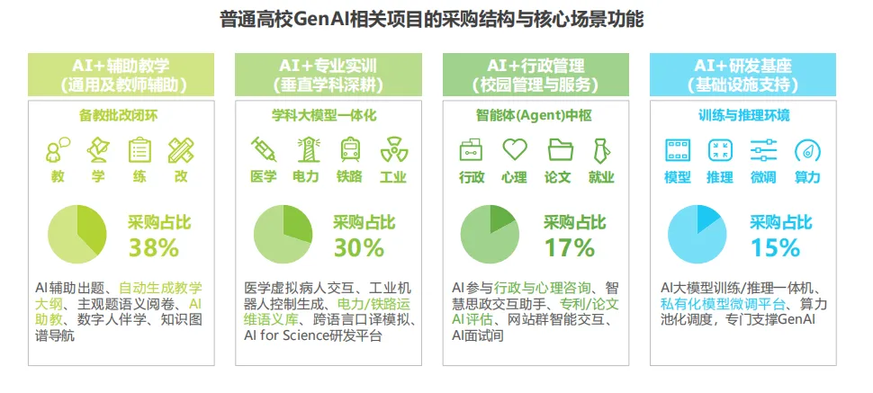 基于本次定量分析的普通高校有效标书样本,普通高校在GenAI的项目需求,首先用于辅助教学,占比38%,核心诉求在于构建备、教、批、改的教学全闭环,通过AI辅助出题、自动大纲生成及主观题智能阅卷;其次是专业实训,占比30%,GenAI正渗透进高校医学虚拟交互、电力信号运维、轨道交通等学科深水区;再次是行政管理方向,占比17%,需求呈现明显的智能体化倾向,AI作为辅导员与智慧思政助手,参与处理复杂的行政咨询与学生服务工作。最后的基础设施/研发基座类的项目,占比15%,重点为部署私有化模型微调平台与推理一体机,确保数据主权与科研安全。