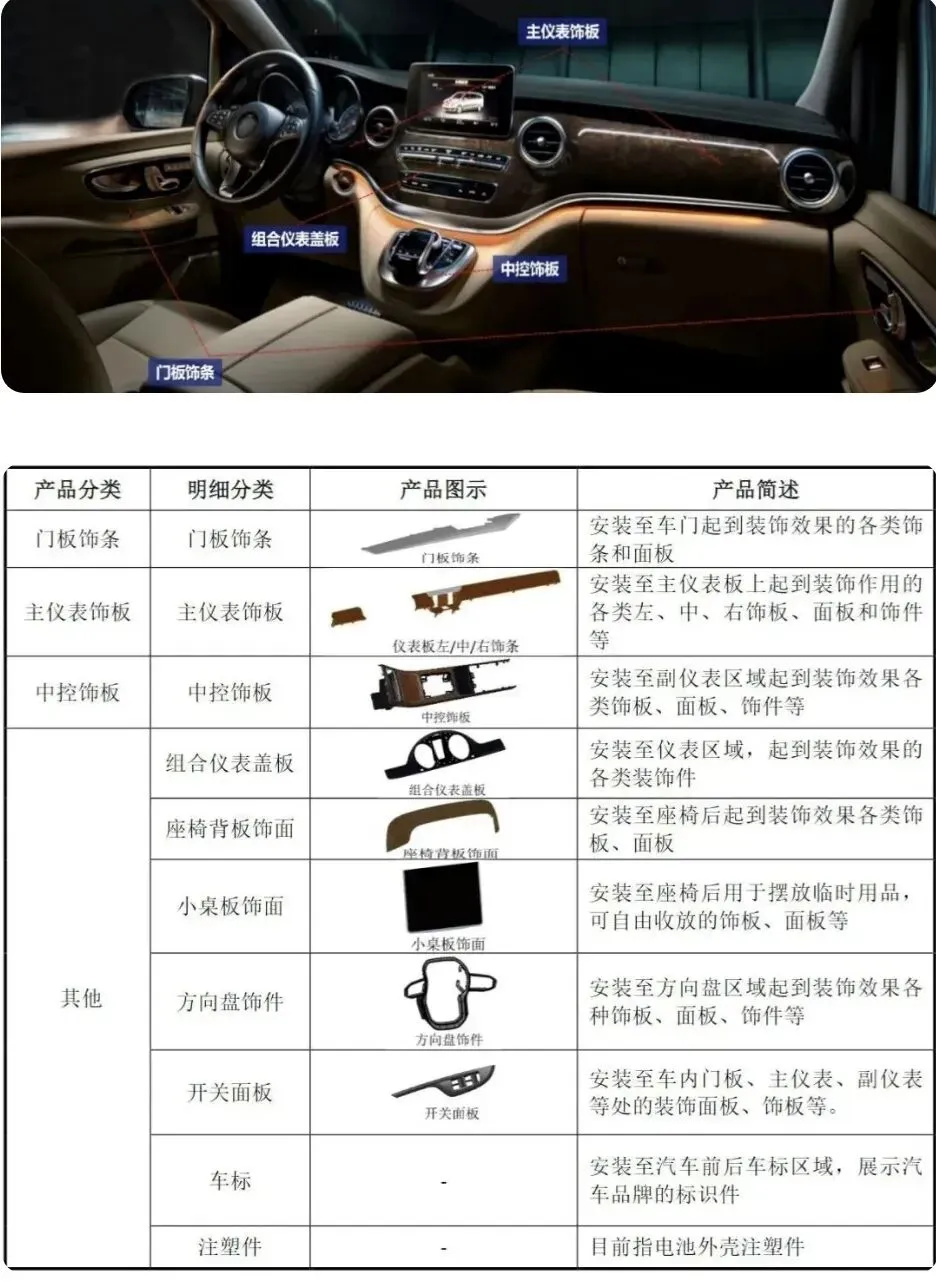生产汽车里面的内饰件,产品主要应用于乘用车的各个部位,可以分为以下几类:门板饰条、主仪表饰板、中控饰板。参考上图就一目了然。?