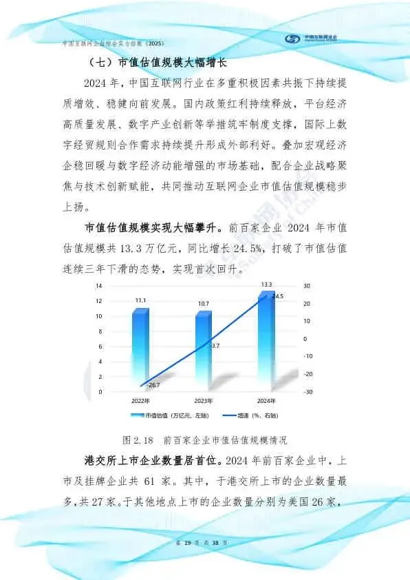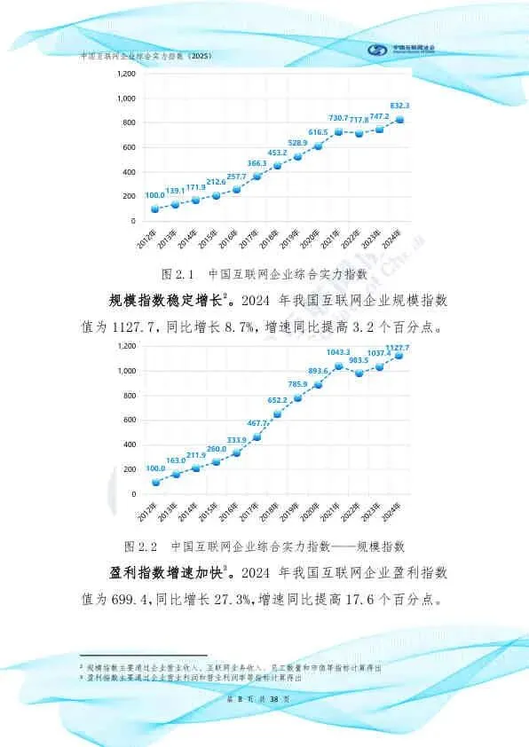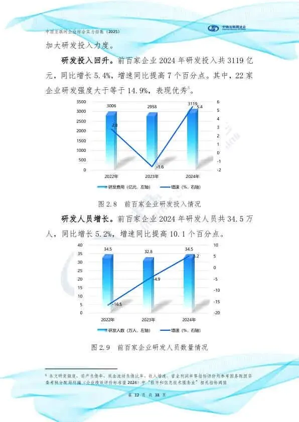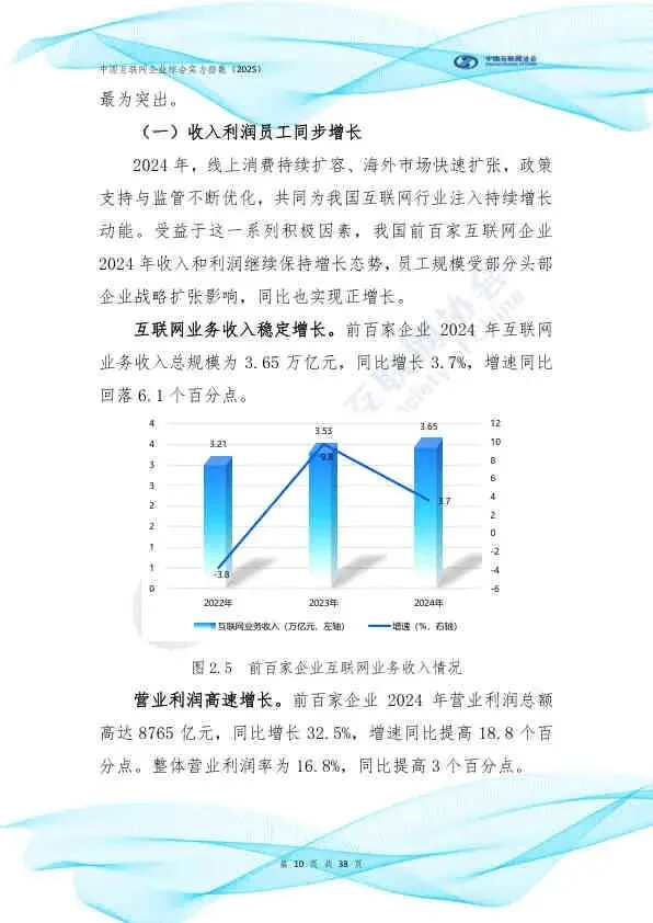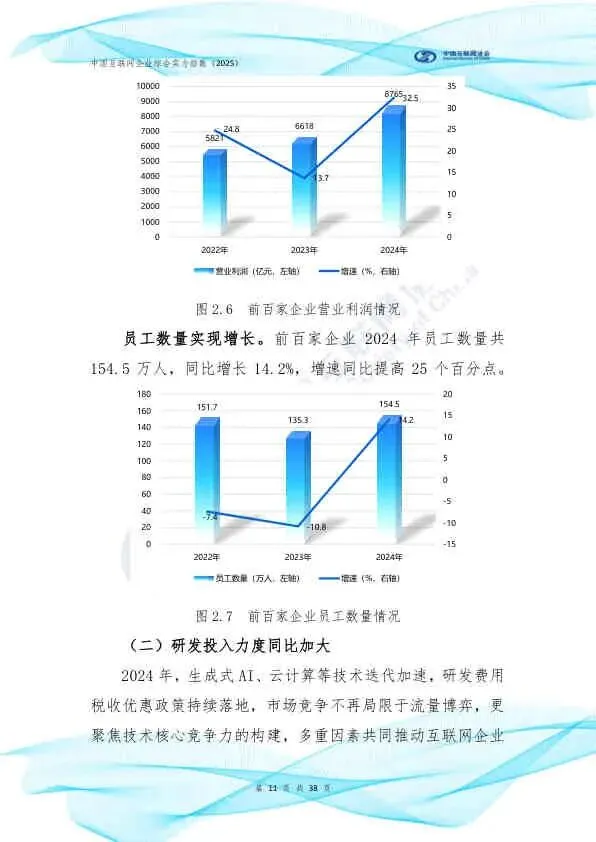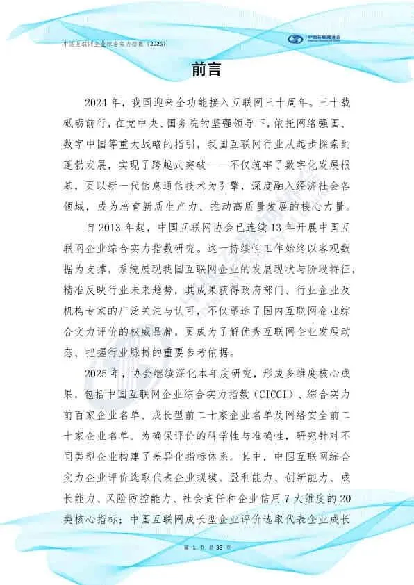 中国互联网行业在全功能接入互联网三十周年之际,展现出强劲的复苏与高质量发展态势。行业整体呈现“分层发展、各具特色”的格局:头部企业实现收入利润双增,研发投入回暖,国际化步伐加快;成长型企业以超85%的平均增速为行业注入新动能;网络安全企业则在筑牢数字安全防线的同时,积极拓展全球市场。这标志着中国互联网行业已从高速增长阶段转向创新驱动、结构优化和价值创造的新阶段。