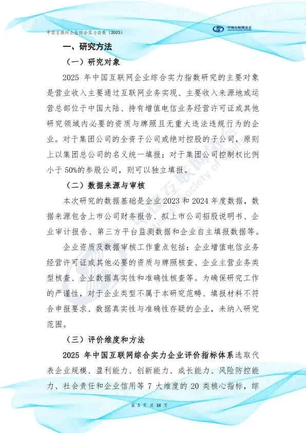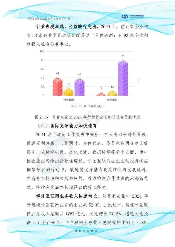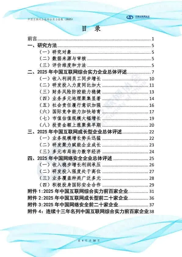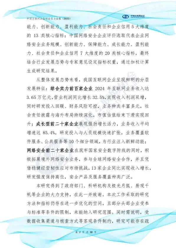 该报告全面展示了中国互联网行业在2024年的韧性与活力。它表明,行业已形成一个层次分明、协同发展的生态体系:头部企业作为压舱石,通过技术创新和全球化布局巩固优势;成长型企业作为生力军,以高增长和灵活性开拓新蓝海;网络安全企业作为守护者,为整个数字经济的健康发展保驾护航。未来,行业的高质量发展将更加依赖于核心技术的突破、商业模式的创新以及对社会责任的深度践行。
