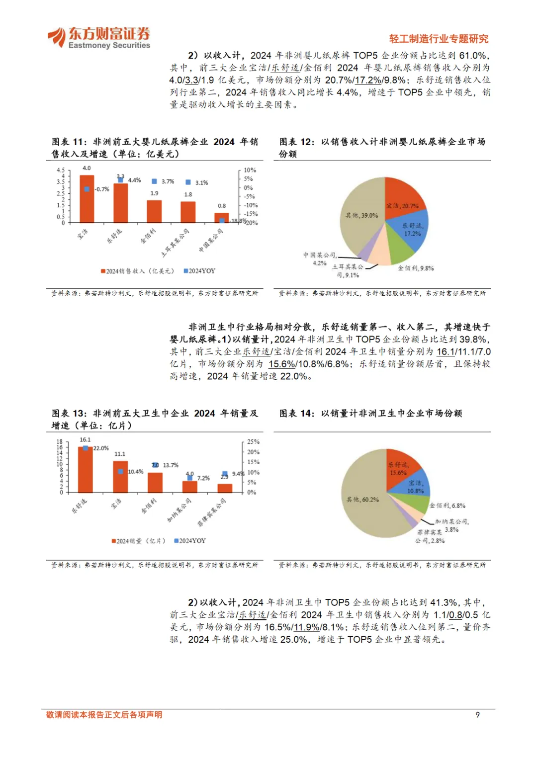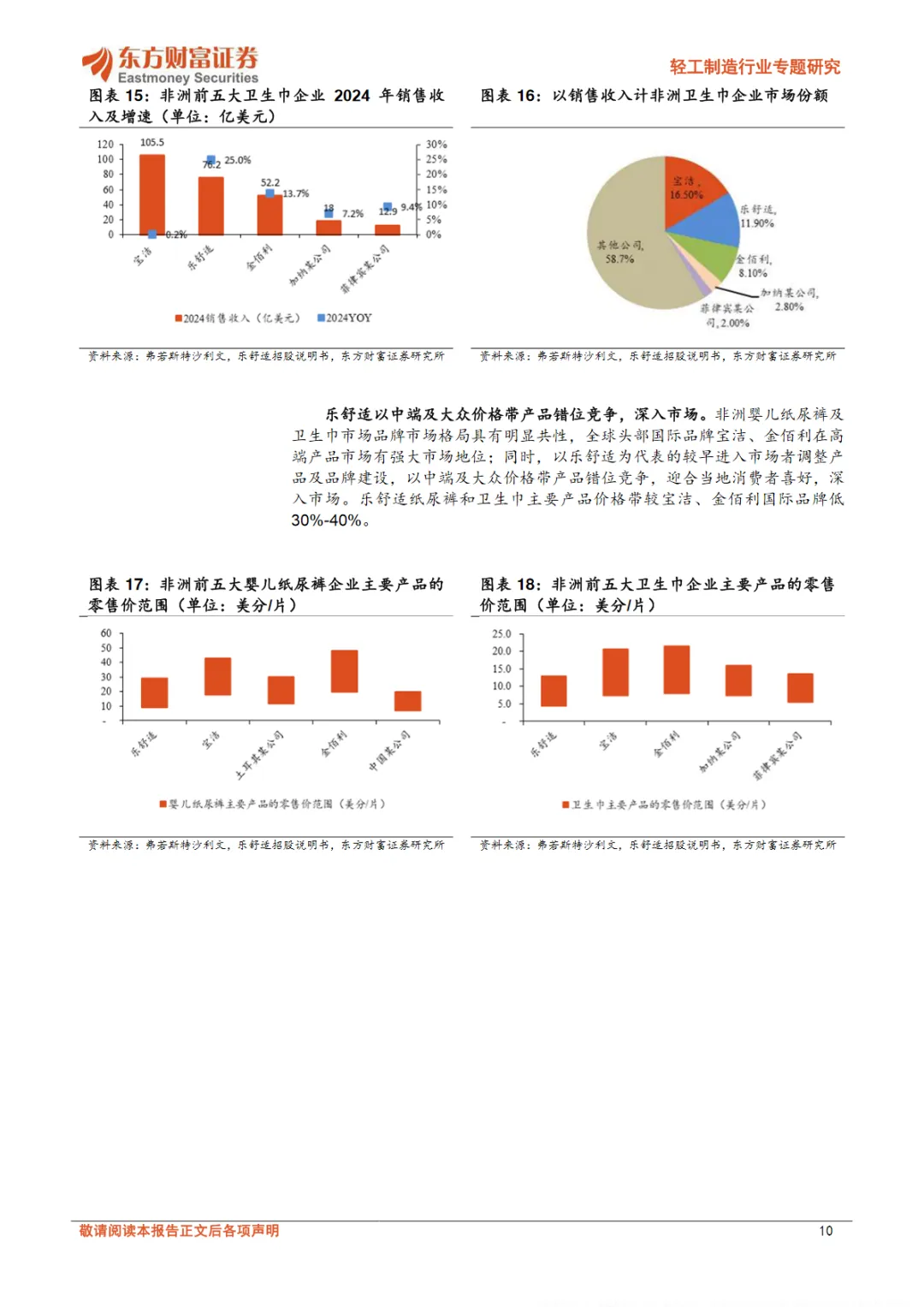 乐舒适通过Softcare、Maya、Cuettie、Veesper等品牌,差异化定位满足市场需求,同时在非洲八个国家拥有八家工厂和51条生产线,有效提高了生产效率。此外,公司在12个国家设立了18个销售分支机构,构建了广泛的销售网络,覆盖超过2800家批发商、经销商、商超和其他零售商,触达80%以上的本地人口。