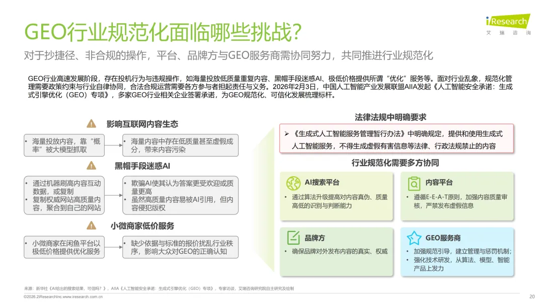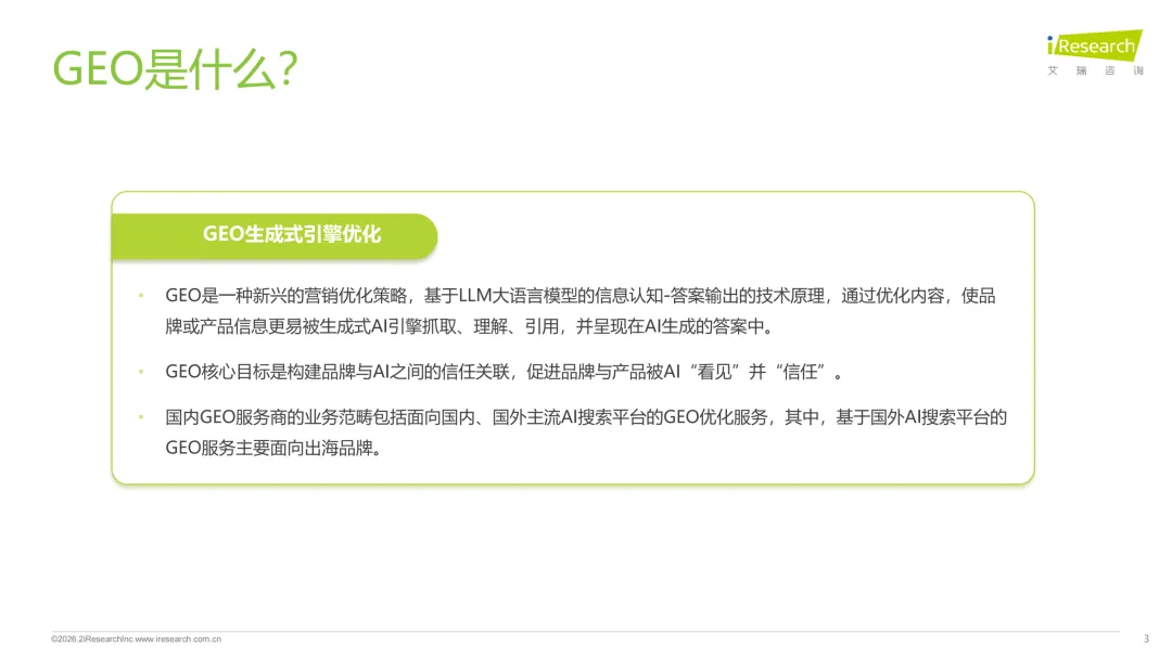 2026年GEO生成式引擎优化行业研究报告显示,中国AI行业已迈入生成式AI规模化应用阶段,GEO作为基于LLM大语言模型的新兴营销优化策略顺势崛起,核心是搭建品牌与AI的信任联结、提升品牌在AI生成答案中的可见性。报告不仅拆解了GEO的技术原理与认知误区,提出以语义优化为核心的内容优化工程和多维度效果评估体系,还梳理了“上游语料资源平台-中游GEO服务商-下游品牌方”的完整行业生态,预计2030年国内GEO市场规模将突破500亿。当前GEO行业呈现生态驱动、闭环交易、严合规性的发展特征,头部服务商案例与行业专家观点均指向,GEO正从流量争夺转向语义空间占领、从信息可见性转向知识权威性,行业规范化与技术升级成为未来发展的关键,而ROI量化、合规化运营也已成为当下行业热门关注点。