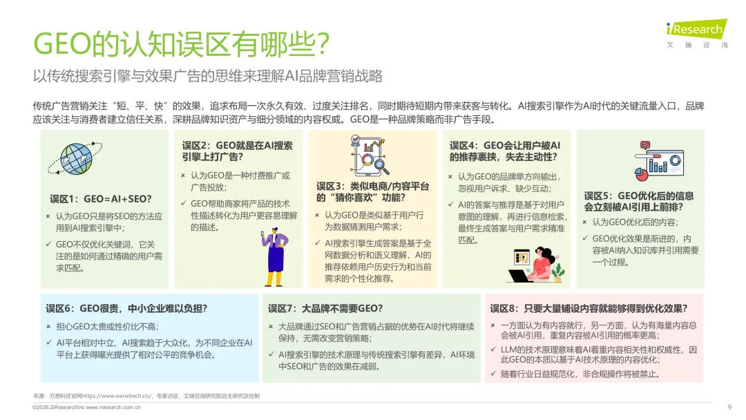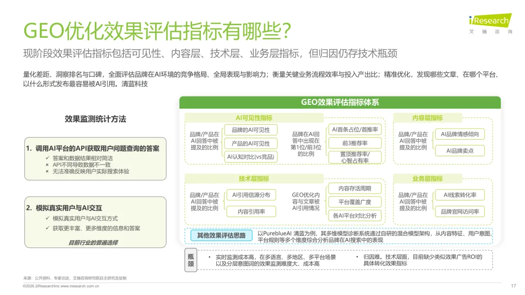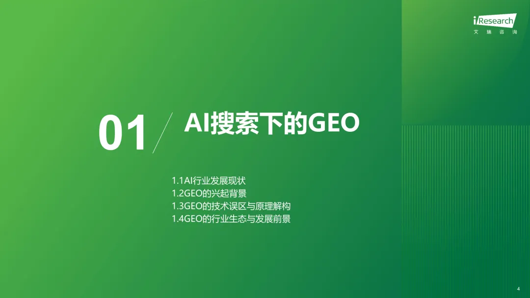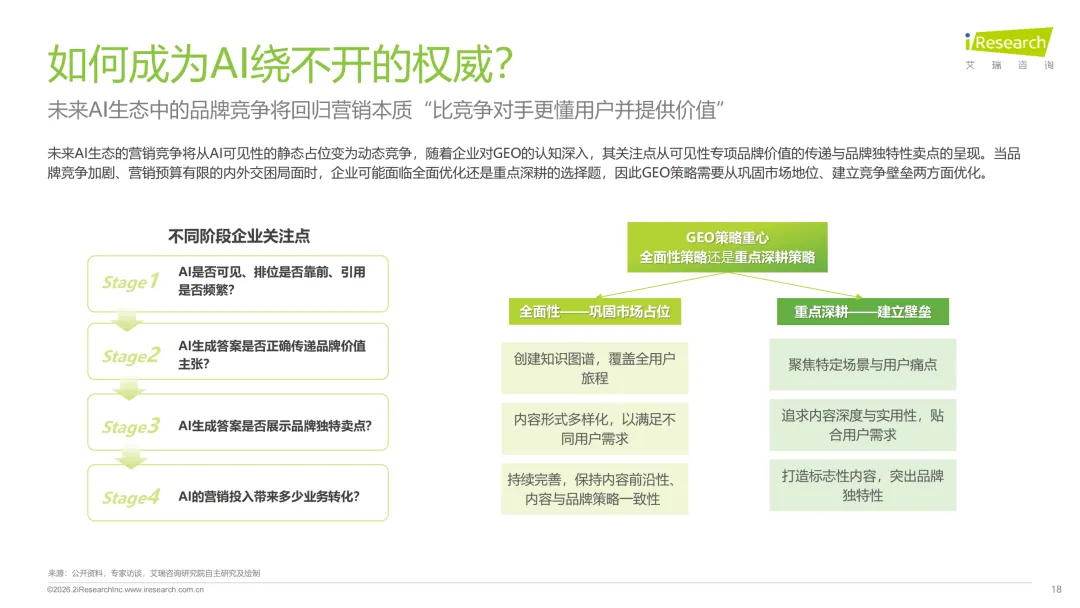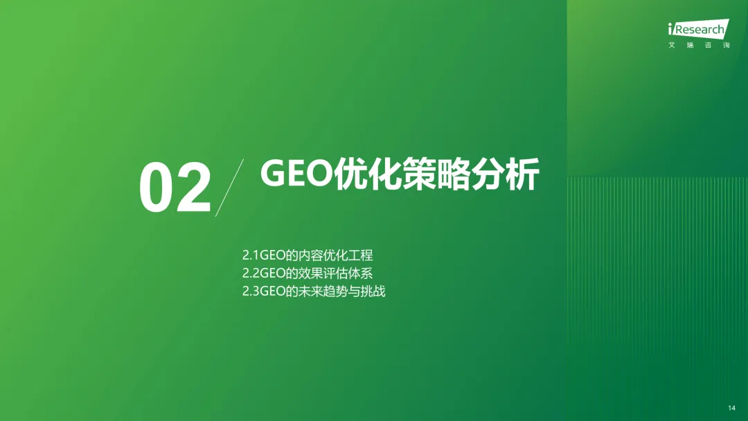增长逻辑主要是存量替代加增量创造。存量替代就是品牌把原来花在SEO、PR舆情管理上的营销预算,慢慢转移到GEO优化上;增量创造则是品牌为了做GEO,构建AI知识库、做网页优化、API对接这些产生的技术服务支出。发展阶段也很清晰,2025到2026年是流量迁徙和预算重构期,用户搜东西越来越依赖AI,品牌有流量焦虑,GEO也进入高速增长期,这一阶段ROI也开始成为品牌评估GEO效果的核心标尺;2027到2030年是成熟普及期,GEO会变成品牌全域认知管理系统,SaaS平台化会成为主流,行业也能实现规模化盈利;2030年之后就是AI经济重塑期,AI流量增长放缓,会出现代理佣金这类新商业模式,传统搜索优化和GEO的市场份额也会慢慢趋于平衡。