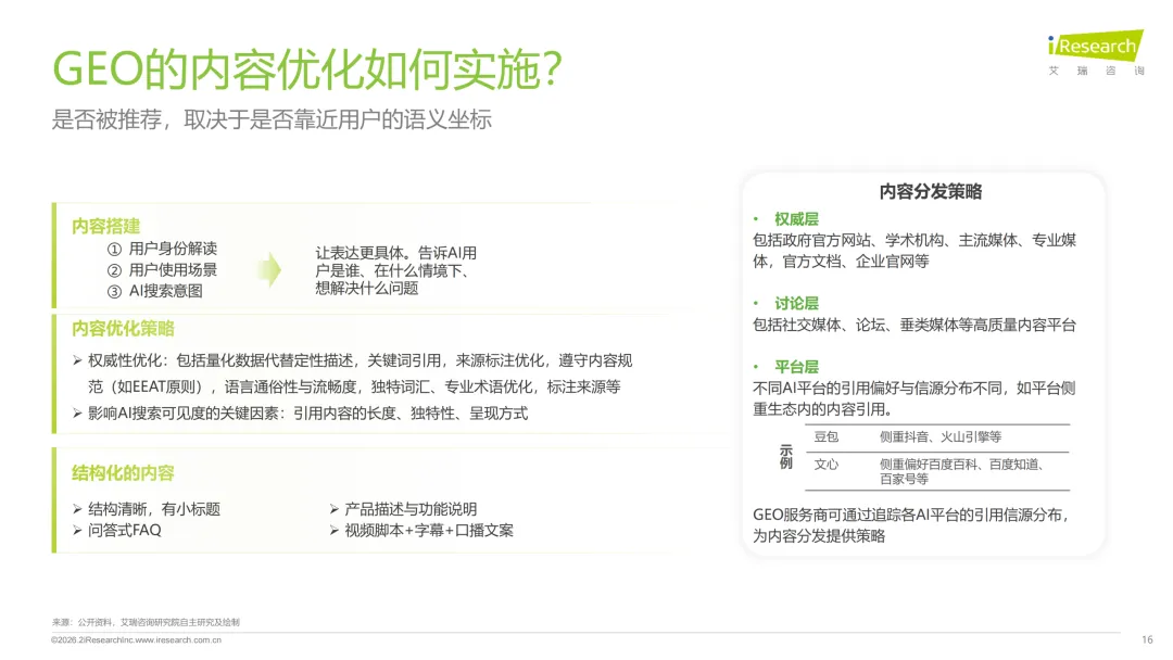 核心还是围绕语义优化,打造一套系统的内容工程。首先得深度读懂用户意图,搞清楚目标用户是谁、用AI搜索的场景和核心需求,还要建问题语料库,覆盖用户各种提问方式。然后是优化内容本身,一方面要做权威性优化,用量化数据代替模糊的定性描述,遵守EEAT原则、标注权威信源,另一方面要做结构化优化,比如用FAQ、HowTo格式,加JSON-LD标记,让AI更容易抓取,这也是当前GEO优化中提升引用率的关键。最后还要分层分发内容,按权威层、讨论层、平台层布局,适配不同AI平台的引用偏好。关键要点就是别做低质量重复内容,保证品牌信息真实、全面、及时,毕竟合规化是行业底线,最终要实现从“被AI看见”到“被AI优先推荐”的升级,真正把GEO优化和品牌增长、ROI提升绑定起来。