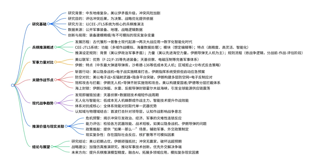 本研究以CEE-JTLS 智能化仿真推演评估系统为核心工具开展美以联合对伊朗先发制人打击的兵棋推演,结合公开军事装备、地理信息等多源数据,模拟了斩首行动、防空对抗、饱和攻击与拦截、海上封锁等关键作战节点,对比分析出美以联军拥有先进武器装备和完善军事体系的优势,伊朗则依托庞大导弹库、无人机力量及区域拒止、分布式反击策略形成独特作战能力;推演清晰展现了 **“发现即摧毁”、无人化智能化、体系对抗、认知域与物理域结合 ** 的现代战争趋势,也揭示出此类冲突将引发中东政治失衡、全球能源市场震荡等灾难性连锁反应,同时指出推演存在国际社会反应、核扩散风险等不可模拟的局限性,最终为军事研究、战略制定提供了危机预警、能力评估等多方面价值,并对未来兵棋推演技术和军事发展提出了相关建议。