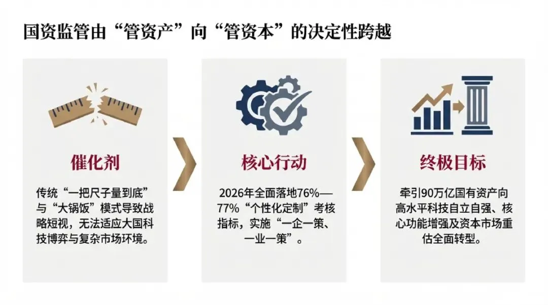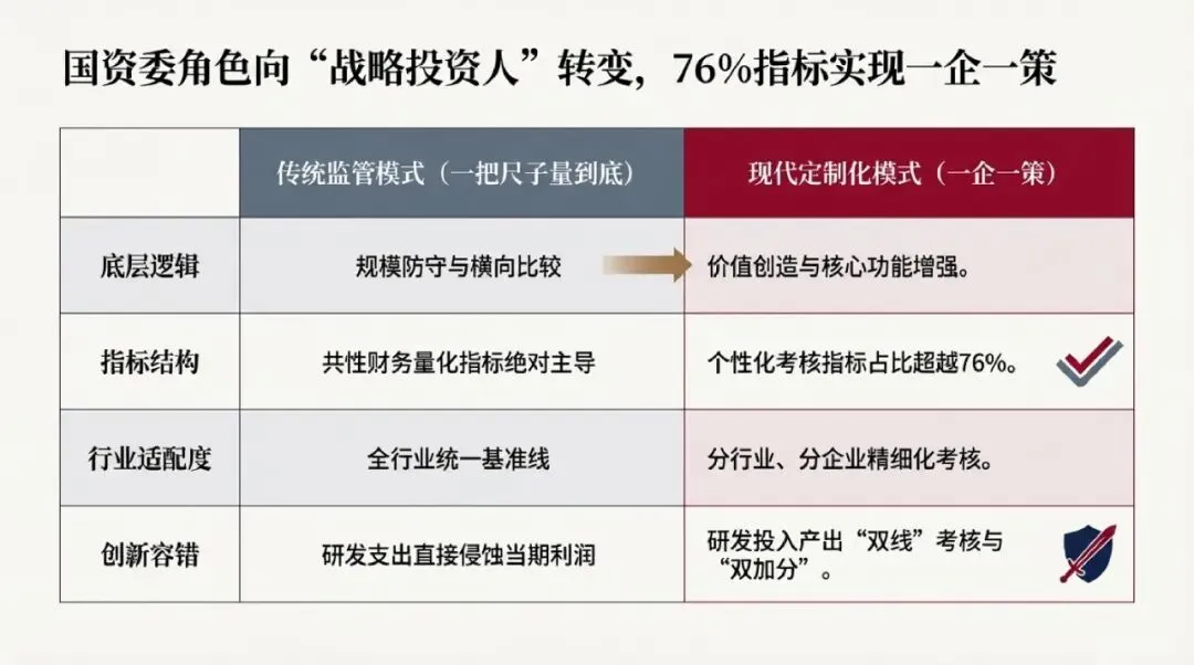 深度研究报告:告别“一把尺子量到底”与国企考核体系的范式重构——基于76%“个性定制”指标的政策解析与战略展望在全球政治经济格局经历深刻调整、新一轮科技革命与产业变革加速演进的历史交汇期,中国宏观经济正处于从高速增长向高质量发展全面转型的关键阶段。作为国民经济的“顶梁柱”与宏观经济基本盘的“压舱石”,国有企业尤其是中央企业的战略定位、运行效能与治理机制,直接关系到国家核心竞争力的构建与中国式现代化的战略全局。长期以来,国有资产监督管理体系在确保国有资产保值增值、防止规模性流失方面发挥了基础性作用。然而,伴随着国企改革进入深水区与攻坚期,传统监管模式中高度同质化的考核标准——即所谓的“一把尺子量到底”——逐渐暴露出与现代企业治理、前沿科技创新以及复杂市场环境不相适应的深层次矛盾。“一把尺子量到底”的本质特征,是以追求规模扩张与短期财务回报为核心导向,采用单一的利润率、资产负债率等刚性财务指标对所有行业、不同功能定位的国有企业进行无差别的横向排队与绩效考核。这种模式在特定历史时期具备降低行政监管成本与快速做大企业体量的合理性,但不可避免地抹杀了微观主体的异质性,导致企业陷入“重短期轻长期、重规模轻质量、重稳妥轻创新”的战略短视陷阱。随着2026年全国两会的召开,国务院国资委主任张玉卓就国资国企改革释放了具有里程碑意义的政策信号:全面告别“大锅饭”,中央企业考核体系发生剧变,高达76%(部分统计口径为77%)的考核指标已变身为“个性化定制”。这一数据的公开披露,不仅标志着“一企一策”差异化考核机制从前沿探索全面走向了制度化落地,更昭示着中国国资国企监管体系已从传统的“管企业”、“管资产”向更加精准、科学、动态的“管资本”与“管机制”迈出了不可逆转的决定性步伐。本报告将以现代契约理论与宏观经济学为分析框架,深度解构这一考核机制剧变的底层逻辑、运行框架及其对产业布局、科技创新与资本市场重估的深远影响,全面呈现“十五五”时期国有企业改革的高质量发展新图景。章 从“规模导向”向“核心功能增强”的考核逻辑重塑委托代理理论表明,最优的激励与考核机制必须与代理人承担的任务特征、信息结构及企业的风险偏好相匹配。对于承担着多重目标的国有企业而言,单一维度的财务考核极易导致“管理短视”与“逆向淘汰”。全面推行76%以上的“个性定制”考核指标,正是对这一理论困境的深刻突破与实践回应。1.1 “一把尺子”的历史局限性与差异化考核的全面确立在过去较长一段时间内,国资监管机构对中央企业及地方国企普遍实行高度统一的年度经营业绩考核体系。尽管这种体系在维系庞大国有资本的安全边界方面卓有成效,但随着央企所涉足领域的急剧扩张与分化,处于充分竞争领域的商业类国企与承担国家战略安全、公共服务职能的公益类国企面临着截然不同的市场环境与战略约束。若继续沿用相同的净资产收益率或营业利润率作为核心标尺,势必造成商业类国企因缺乏针对性市场激励而活力不足,同时迫使公益类或战略类国企为迎合财务指标而削减关乎国家长远利益的战略性投入。国务院国资委在2024年中央企业、地方国资委考核分配工作会议上明确提出,全面实施“一企一策”考核,统筹共性量化指标与个体企业差异性,根据企业功能定位、行业特点、承担重大任务等情况,增加反映价值创造能力的针对性考核指标。至2026年,这一差异化考核机制不仅全面推开,更在指标结构上实现了彻底颠覆,个性化指标占比达到76%至77%的绝对主导地位。这意味着,国资委不再单纯扮演“财务审核员”的角色,而是转变为深谙产业规律的“战略投资人”,通过“一企一策、一业一策”的精准考核,牵引不同类型的国有企业向各自的高质量发展目标演进。| 考核维度比较 | 传统监管模式(“一把尺子量到底”) | 现代定制化模式(“一企一策、个性定制”) |