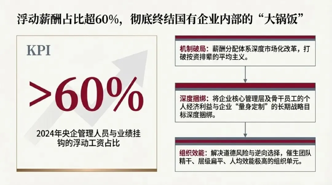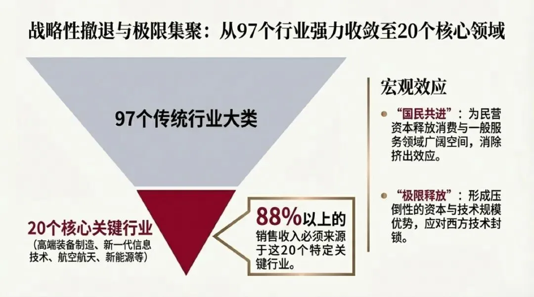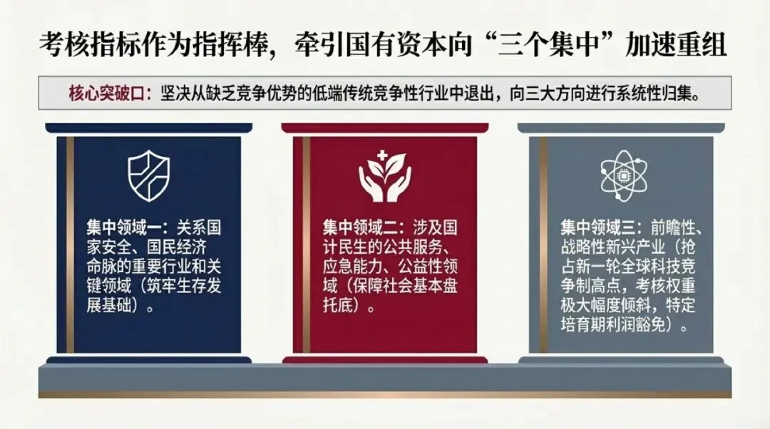 考核机制的有效性,最终必须通过与之高度绑定的激励分配机制来落实。若考核指标高度定制,而薪酬分配依然遵循按资排辈的“平均主义”,则考核的牵引力将大打折扣。为此,国资委在推行个性化考核的同时,大刀阔斧地推进了企业内部薪酬分配体系的市场化改革。相关数据显示,早在2024年,央企管理人员与业绩挂钩的浮动工资占比已超过60%。这一极具弹性的薪酬结构,配合高达76%的定制化战略考核指标,彻底打破了长期以来部分国有企业内部事实上的“大锅饭”现象。通过将企业核心管理层及骨干员工的个人经济利益与企业“量身定制”的长期战略目标进行深度捆绑,有效解决了委托代理关系中的道德风险与逆向选择问题。正如国资委负责人在总结机制型改革突破时所指出的,当前部分央企内部已涌现出大量团队极其精干、管理层级非常扁平、但人均效能极高的组织单元,其成功密码正是源于这种高度灵敏且强挂钩的激励机制。章 产业重构的指挥棒:国有资本布局的“三个集中”与“行业收敛”宏观效应考核指标从来都不是孤立存在的评估工具,而是牵引宏观资本流向与产业空间布局的强力“指挥棒”。在76%定制化考核的驱动下,中国国有经济的宏观布局与结构调整正以前所未有的雷霆万钧之势,向“三个集中”方向实行深度的战略性重组。这一过程并非简单的资产腾挪,而是基于国家宏观安全与产业链韧性的系统性重塑。面对复杂严峻的国际地缘政治经济博弈与全球供应链重构压力,国有资本必须在关键时刻发挥不可替代的底层支撑作用。国资委主任张玉卓明确宣告,新时期全面深化国企改革的核心突破口之一,即是把更多的国有资产往“三个集中”的方向进行系统性归集。这“三个集中”明确界定了未来中国国有资本的活动边界与投资重心:其一,集中到关系国家安全、国民经济命脉的重要行业和关键领域,筑牢国家生存与发展的基础;其二,集中到涉及国计民生的公共服务、应急能力、公益性领域等,发挥保障社会基本盘的托底作用;其三,集中到前瞻性、战略性新兴产业,抢占新一轮全球科技竞争的制高点。这一战略部署意味着,国有资本将逐步且坚决地从缺乏竞争优势、不符合国家战略导向的低端传统竞争性行业中退出。这种结构性收缩并非国有经济的退步,而是为了从根本上改变过去国有资本“战线过长、分布过广、高端控制力不足、低端无效资产占比过多”的痼疾。通过战略性的“退”,换取在核心关键领域的绝对“进”,实现有限资源的帕累托最优配置。2.2 “97退至20”与“88%营收占比”的产业组织分析在“三个集中”的顶层战略指导下,国资委提出了一个极具颠覆性与量化特征的宏观结构调整目标:预期经过几年的努力,要把中央企业的国有资产,从国民经济原有的广泛分布,强力收敛集中到97个行业大类当中的20个核心行业之内。最终的布局目标是,以销售收入计算,中央企业88%以上的销售收入必须来源于这20个特定的关键行业。这一极度收敛的产业布局目标,在宏观经济学和产业组织演化理论上具有深远的系统性影响:首先,这构建了“国民共进”的良性宏观生态。通过从77个非核心行业大类中实施战略性撤退,庞大的国有资本为民营资本与中小企业释放了极其广阔的市场空间。在充分竞争、强调敏捷迭代的消费与一般服务领域,民营资本将能够更加从容地发挥其灵活创新的比较优势,从而在宏观层面上消除了资本的“挤出效应”。其次,这是规模经济与范围经济的极限释放。将数以十万亿计的国有资产高密度地聚集于20个核心战略领域(如高端装备制造、新一代信息技术、航空航天、新能源及核心基础材料等),能够迅速形成压倒性的资本与技术规模优势,这是应对西方发达国家技术封锁与“卡脖子”挑战的唯一可行路径。最后,88%的销售收入集中度,意味着未来央企的盈利模式将彻底告别广泛撒网、依靠多元化对冲风险的粗放型增长模型,转向依靠深耕核心主业、提供高附加值产品与服务的高质量利润贡献。为了确保“三个集中”战略的落地,考核体系在战略性新兴产业(战新产业)方向进行了极大幅度的权重倾斜。早在2024年的考核分配工作会议上,国资委就明确将强化战略性新兴产业收入和增加值占比作为核心新增考核内容。随后的数据印证了这一政策的威力,2024年度,央企在战略性新兴产业领域的投资占总投资的比重已成为衡量企业转型速度的最核心指标之一。科技成果从实验室走向产业化的过程中,必然经历高风险、高失败率的“死亡之谷”。如果依然采用刚性的财务回报率进行考核,任何理性的企业管理者都会本能地规避战新产业的早期投资。通过为战略性新兴产业设定特定权重的“个性化定制”考核指标,甚至在特定培育期内对利润指标进行豁免或抵扣,国资委实际上为央企跨越技术创新的“死亡之谷”提供了制度层面的资本庇护。这种考核的倾斜,从根本上强化了国有经济在服务国家战略功能以及科技创新方面的长远布局能力。章 跨越“死亡之谷”:基础研究的长周期考核与科技赋能机制创新创新是引领发展的第一动力,而基础研究则是科技创新的总开关。面对大国博弈的日趋白热化,作为国家战略科技核心力量的中央企业,必须在基础研究与原始创新领域承担起历史重任。然而,基础科学研究具有投资规