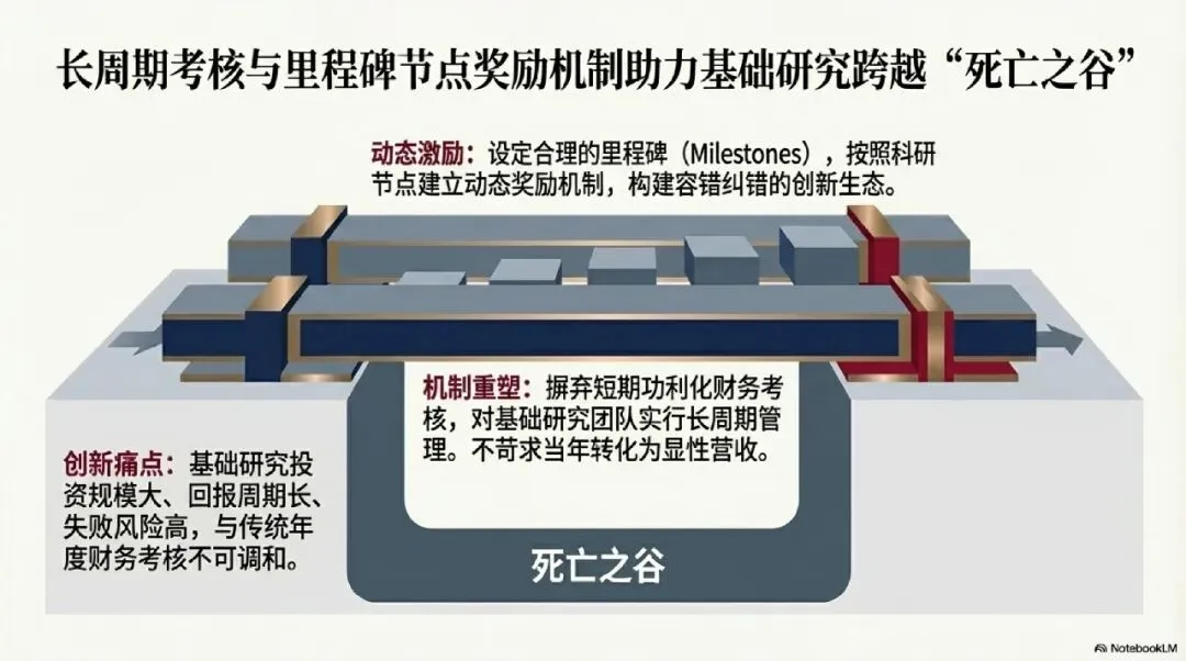 | 核心机制保障二:管理端 | 长周期考核与节点奖励机制 | 匹配基础研究规律,避免因短期不出成果而被中断 |