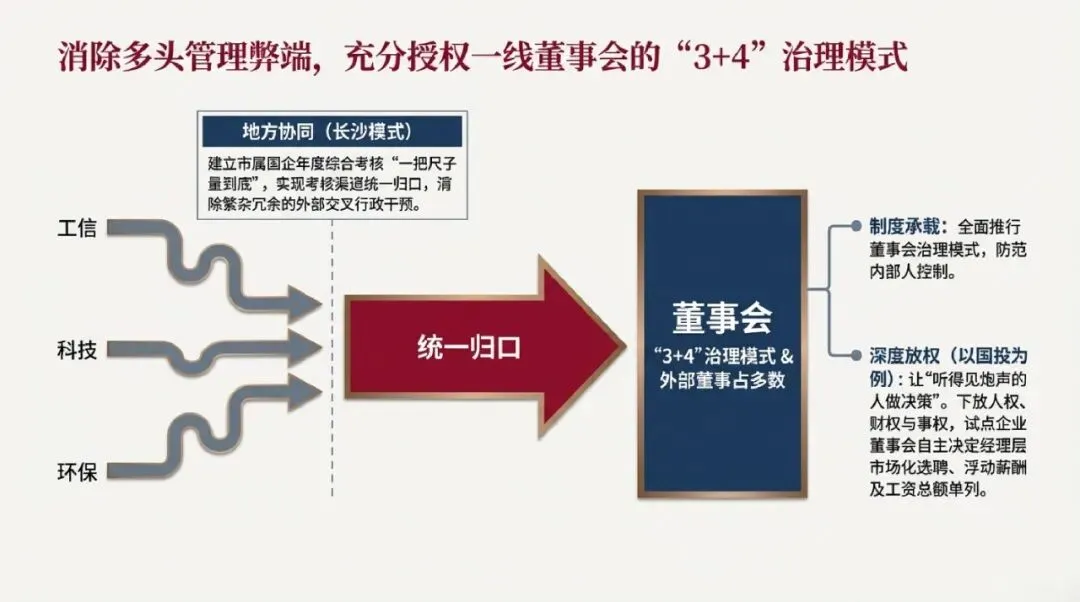 解决了“资金敢不敢投”以及“过程如何考核”的问题之后,如何合理分配科技创新所衍生的巨大增量价值,成为彻底激发企业内生动力的最后一环。针对处于创新链条后端的开发应用型科技人员,国资委明确提出,必须建立并完善科技成果赋能的相关机制。科技成果赋能,意味着研发人员不再仅仅是按月领取固定薪酬的技术雇员,而是能够通过岗位分红、项目收益分成、股权期权激励以及科技成果转化作价入股等多元化的长期赋能工具,深度参与到科技成果产业化所带来的资本增值分配中。这一机制将科研骨干的人力资本与企业的物质资本进行了深度融合,从根本上激活了微观个体的创新活力与主观能动性,使得创新不再是迫于上级考核的被动行为,而是源于内生利益驱动的自发追求。章 放管结合的治理边界:穿透式智能监管与微观主体授权体系现代国资监管体系始终面临着一个深刻的治理悖论:管得过严、标准过死,则企业沦为行政指令的执行机器,彻底丧失应对市场变化的敏捷性;而放得过松、缺乏有效约束,则极易导致严重的内部人控制与国有资产流失。国资委在全面实施76%指标“个性定制”、赋予微观企业更大经营自主权的同时,必须在监管技术与治理制度上进行同步的革命性升级,以实现“放得活”和“管得好”的辩证统一。4.1 数字化底座:穿透式智能监管与全天候风险预警为了支撑“一企一策”的大规模放权,国资委在监管端部署了具有世界领先水平的数字化技术底座——智能化、穿透式的监管体系。传统的国资监管高度依赖事后的财务报表审计、多重行政审批与人工驻场检查,这种模式不仅监管成本高昂,且存在严重的信息滞后性,往往在风险已经酿成巨大损失后才被动介入。而张玉卓主任强调的新型智能化、穿透式监管体系,确立了“既不干预企业的日常经营,不干预企业的经营自主权,同时又能够实时监测”的全新行为边界。该体系依托大数据与企业ERP系统的深度直连,实现了对企业生产经营活动的实时监测。特别是通过对资金流转节点和现金流量的穿透式追踪,监管机构能够瞬间识别出异常的资金归集、违规的关联交易以及潜在的流动性枯竭风险。现金流是企业的血液,这种建立在底层数据模型之上的“无感监管”,使得监管部门能够在不阻断企业日常业务流转的前提下,建立起极其敏捷的风险预警和防范机制。这彻底重塑了出资人与国企之间的信息不对称结构,构筑了“放权而不失控”的根本保障。4.2 地方监管逻辑的协同辨析:长沙模式的“一把尺子”新解在深入剖析国资监管体系时,必须准确辨析不同层级语境下政策表述的深层含义。在中央层面,“告别一把尺子量到底”指的是摒弃单一的业绩评价指标,推行定制化考核;然而在地方实操层面,例如湖南省长沙市国资委,则提出了建立市属国企年度综合考核“一把尺子量到底”机制。这两者不仅没有矛盾,反而是针对不同治理痛点的高度互补。长沙模式中的“一把尺子量到底”,其核心语境是解决地方国资多头管理的体制弊端,旨在“实现考核主体全覆盖、渠道统一归口”。过去,地方国企往往需要同时应对来自国资、工信、科技、环保等多个部门的交叉考核,指标相互冲突,使得企业疲于奔命。长沙市通过将考核渠道统一归口至国资委这一核心出资人,清除了繁杂冗余的外部行政干预,从“被动应对”转向“主动监管”,实现了出资人对市属国企的精准有效监管。同时,在产业布局上,长沙市国资委的前瞻性动作与中央精神高度一致。在“十四五”收官与“十五五”启幕的关键节点,长沙锚定“三高四新”美好蓝图,前瞻布局智能网联汽车产业集群,推动马栏山视频文创产业生态集聚,培育生物医药与大健康产业,大力发展新能源与装配式建筑。这正是中央倡导的向战略性新兴产业“集中”在地方经济版图上的生动实践。4.3 公司治理的制度承载:从“3+4”模式到充分授权体系外部考核机制的转变与监管技术的升级,最终需要企业内部现代公司治理结构的承载。在地方层面,长沙全面推行了“董事会'3+4'治理模式”和“外部董事占多数”制度,极大地强化了董事会的独立决策主体作用,有效防范了内部人控制风险。在中央层面,更深层次的微观授权正在发生以激发内生活力。以国家开发投资集团(国投)等试点企业为例,为了克服过去国资监管“一把尺子量到底”导致的企业活力不足问题,国投在制度规定和协议章程约定中,给予了下属试点企业更为充分的管理自主权,真正落实了现代管理学中“让听得见炮声的人做决策”的核心理念。在此框架下,试点企业的董事会不仅具备战略决策权,更可自主决定经理层成员的市场化选聘、考核管理办法、浮动薪酬甚至履职待遇等;工资总额亦可实行集团内单列管理,由有关子公司在合法合规前提下自主决策。同时,华侨城等企业也积极成立攻坚小组开展混改专题评估,推动资本结构的多元化。这种将人权、财权与事权下放至法人治理结构核心的深度放权机制,配合76%的个性化考核指标,使得国有企业能够以极其敏锐的触觉响应自由市场的瞬息万变。此外,在改革的深水区,国资国企始终将政治建设摆在首位。企业进一步建立完善学习贯彻重要指示批示精神的第一议题制度,确保在政治立场、政治方向上同党中央保持高度一致,推动理论创新成