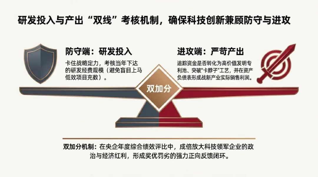 | 核心机制保障一:考核端 | 研发投入产出“双线”与双加分 | 将研发投入视作利润加回,消除管理层当期业绩顾虑 |