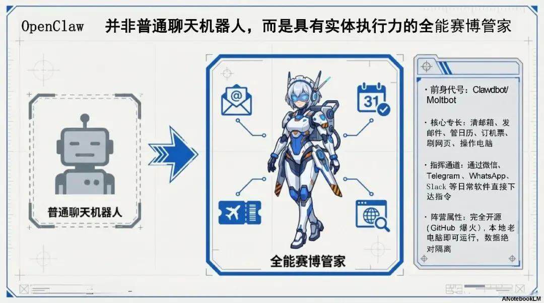 - AI 与人类的协同进化:OpenClaw 不仅仅是一个聊天机器人,而是具备执行能力的 AI 助手,能够操作电脑、清邮箱、订机票、写代码等,实现人机共生。