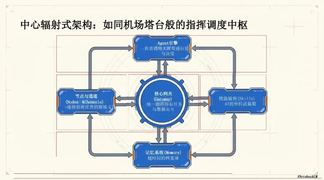- 中心辐射式架构:通过网关(Gateway)作为中枢,管理多个通讯频道和执行终端,实现任务的自动化拆解与执行。