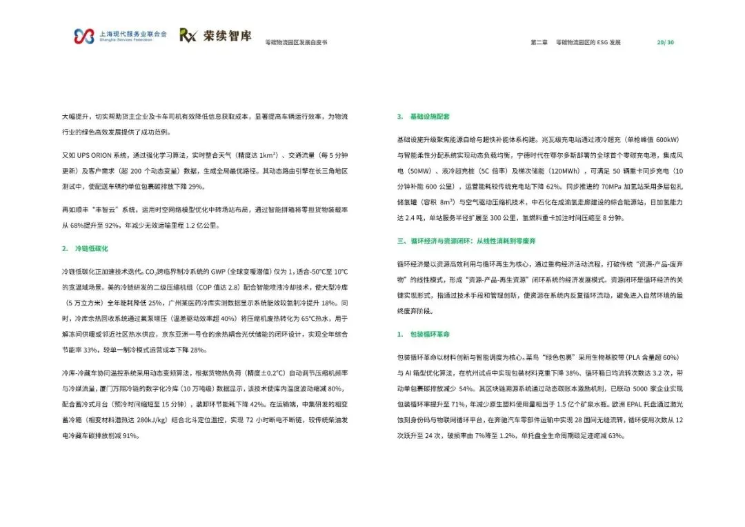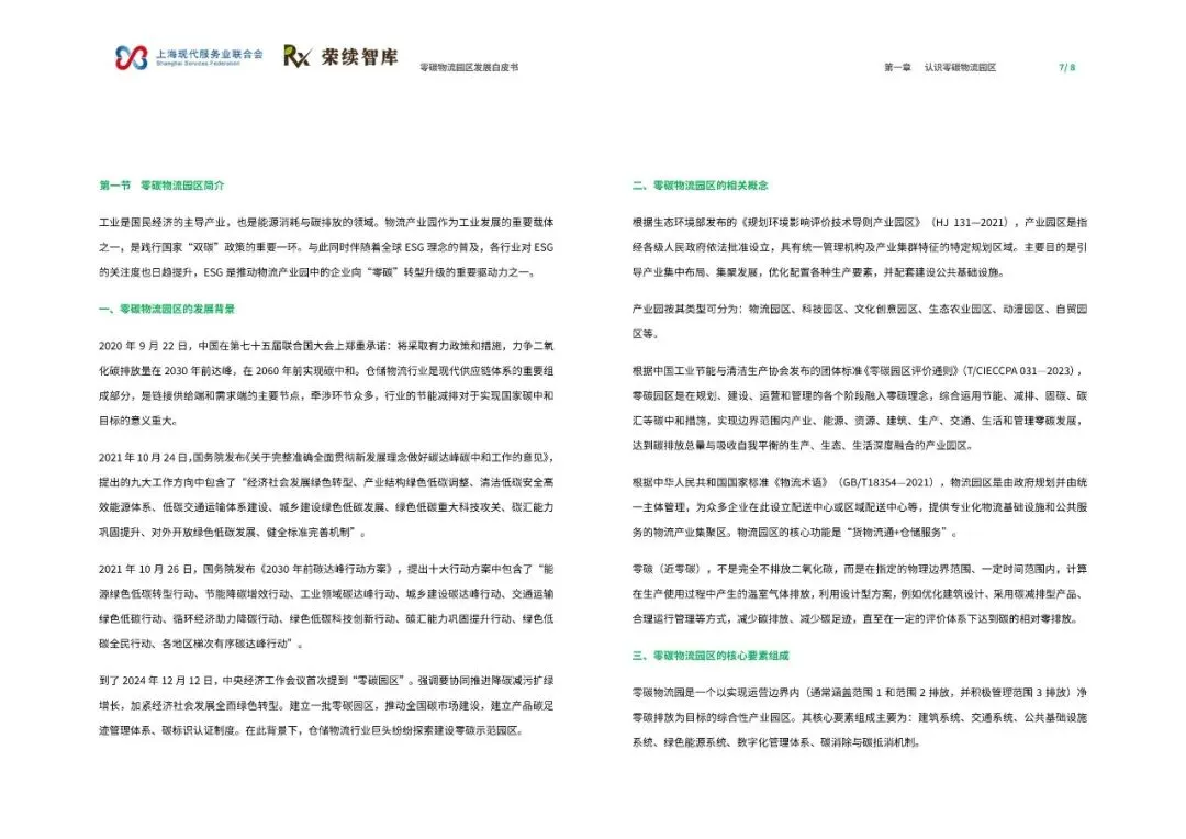 《零碳物流园区发展白皮书》由上海现代服务业联合会与荣续智库联合发布,旨在系统梳理零碳物流园区的内涵、发展路径与关键技术,为行业绿色转型提供实践指南。白皮书指出,作为现代物流体系的核心节点,物流园区的零碳转型不仅是践行国家‘双碳’战略的关键环节,更是企业提升ESG表现、实现可持续发展的必然选择。