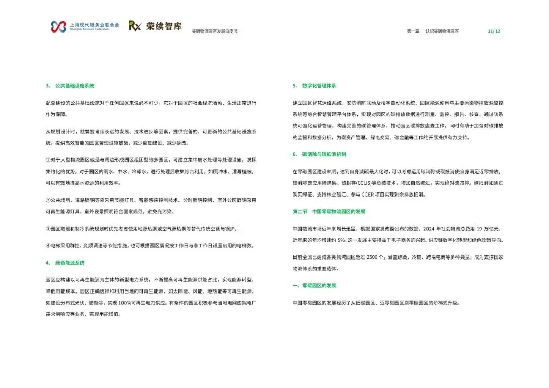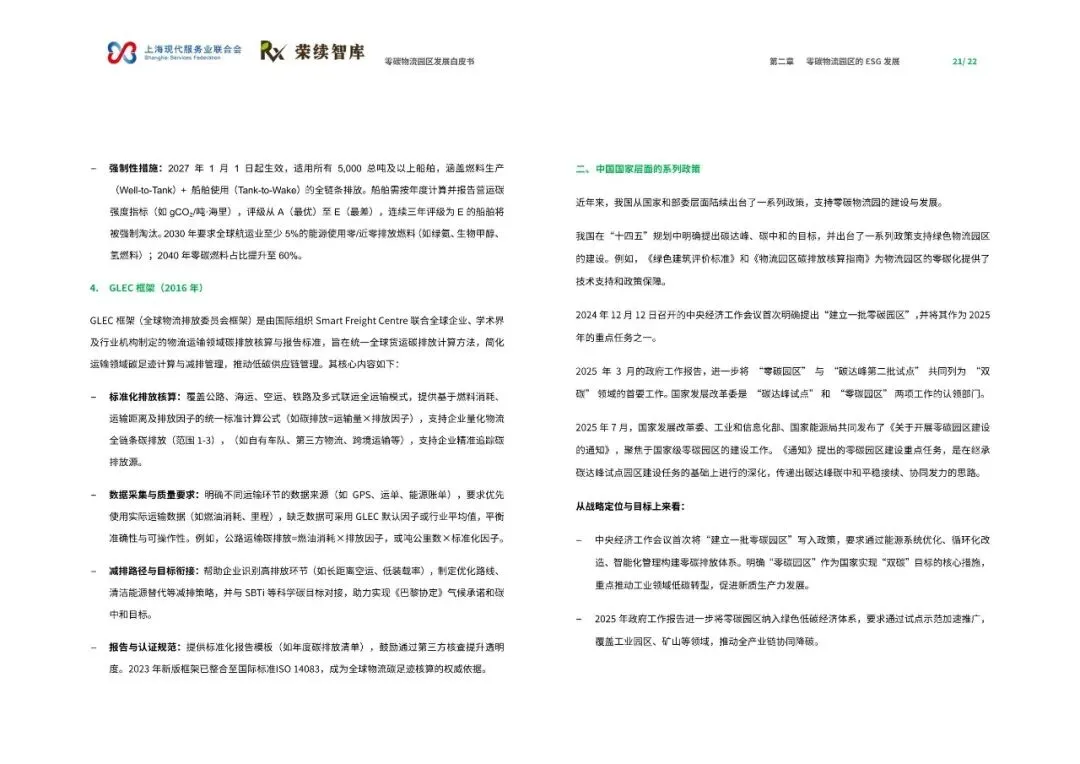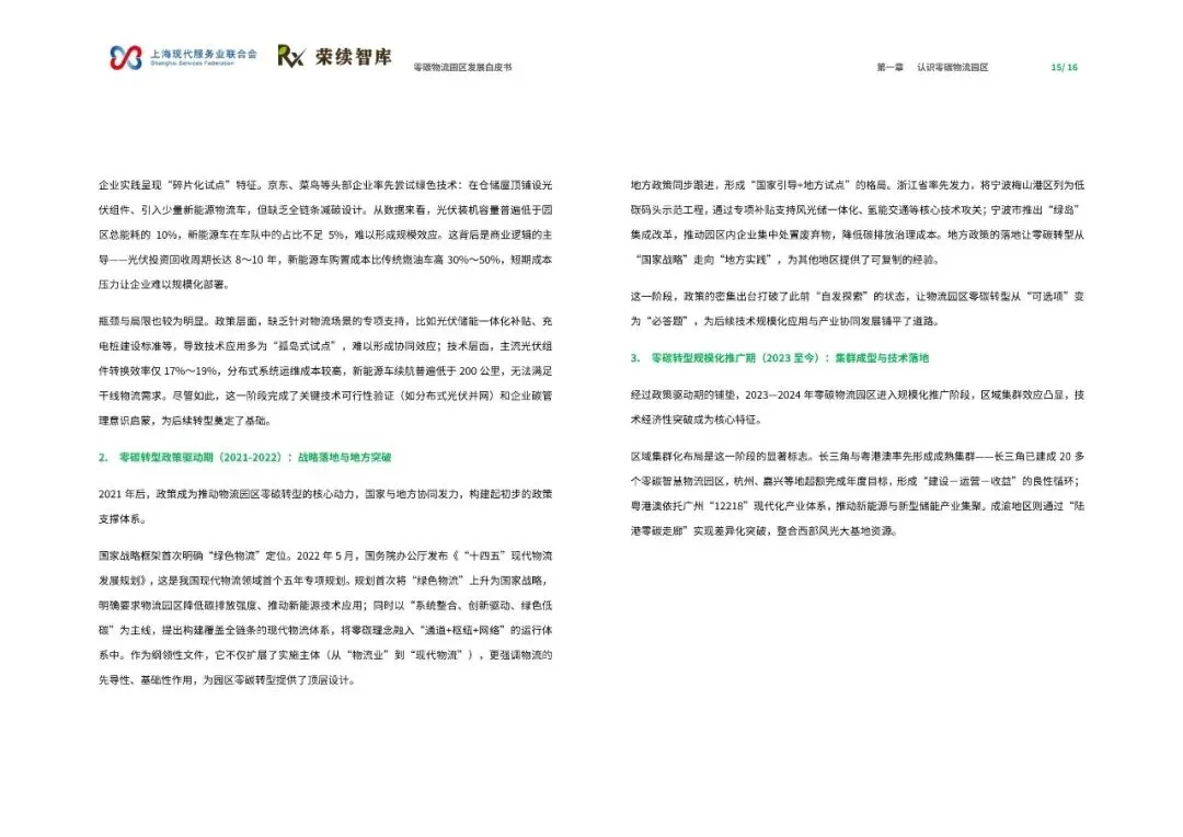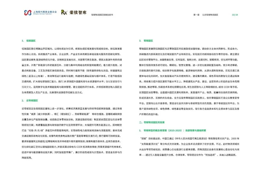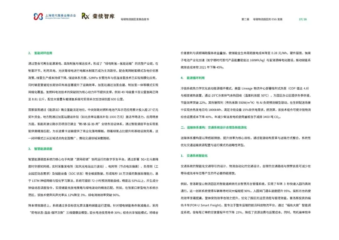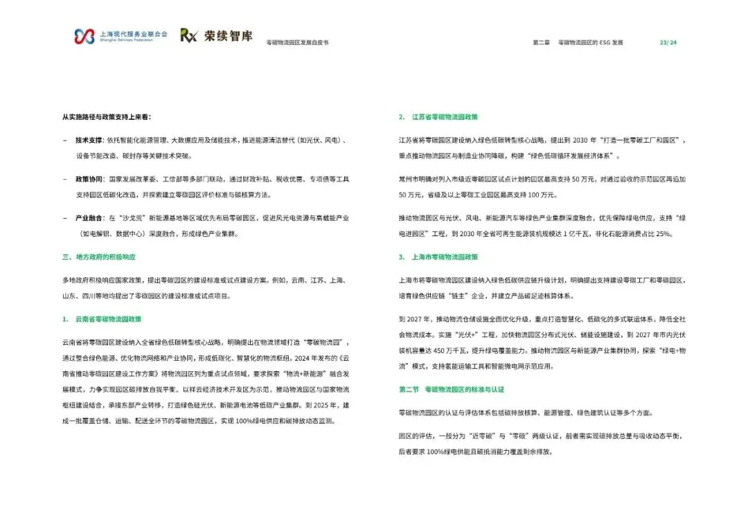 技术层面,白皮书详细介绍了分布式光伏、储能系统、电动重卡、氢能交通、智能能效管理平台、建筑信息模型(BIM)、碳捕集利用与封存(CCUS)等关键技术的具体应用。政策与标准体系是另一大支撑。白皮书梳理了从国家‘双碳’目标、行动方案到地方发展规划、财政激励的多层次政策框架,并援引了《零碳园区评价通则》、《物流术语》国家标准等,为园区的规划、建设与认证提供了依据。