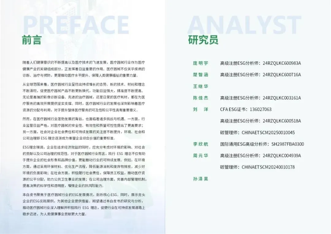 对于医疗器械行业,环境层面的核心议题包括绿色材料应用、能源管理及医疗废弃物处理;社会层面涵盖产品安全与质量、数据隐私保护、医疗可及性与员工权益;治理层面则强调合规经营、供应链管理及创新伦理。报告认为,践行ESG不仅是企业履行社会责任的表现,更是构建长期竞争力、应对严格监管和市场需求变化的关键。行业未来需将ESG深度融入企业战略,通过技术创新与管理优化,在保障人类健康的同时,实现与环境、社会的和谐共生。