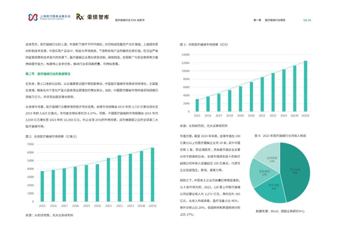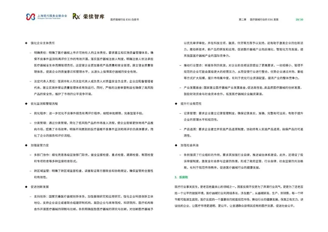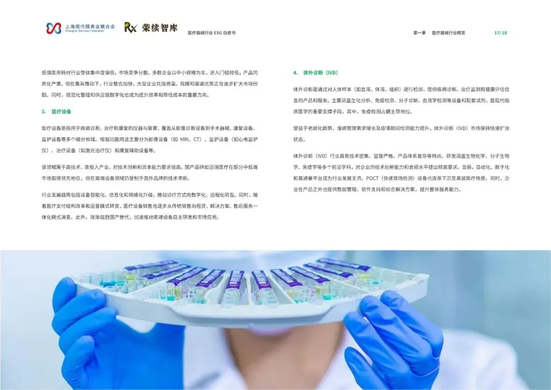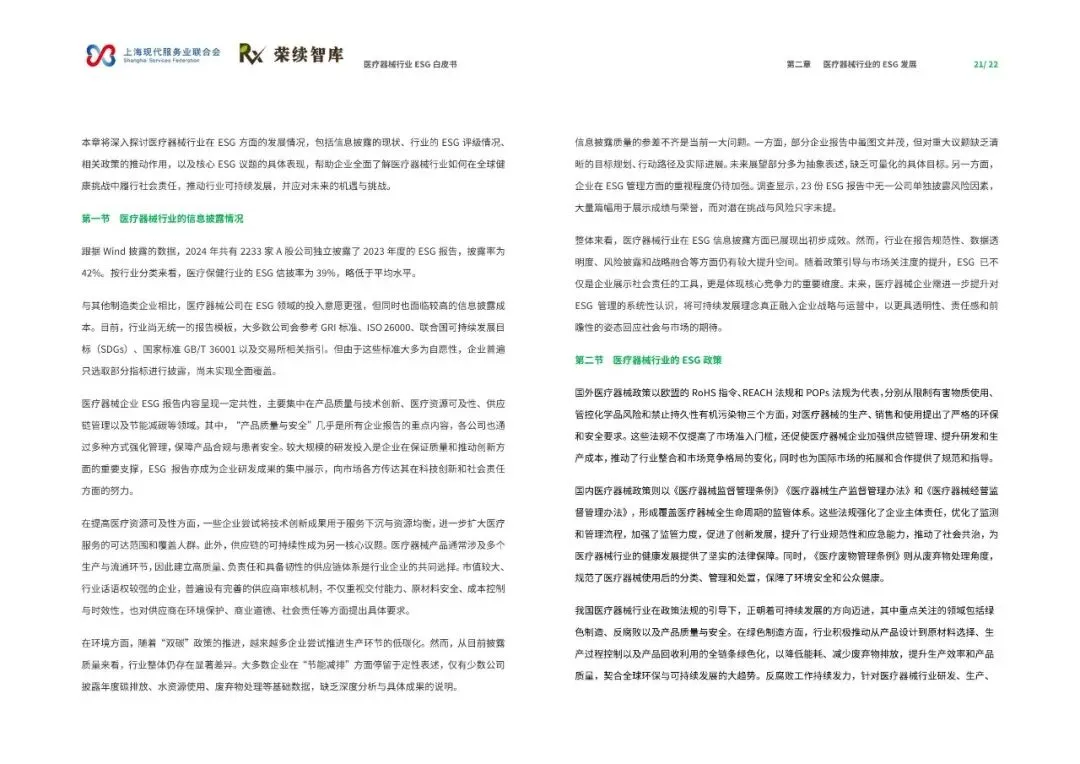 《医疗器械行业ESG白皮书》由上海现代服务业联合会与荣续智库联合发布,聚焦医疗器械行业在环境、社会和公司治理(ESG)领域的发展与实践。报告深入剖析了行业在政策、技术与全球供应链变革背景下的成长轨迹,旨在推动行业深入理解并积极践行ESG理念,实现可持续发展。