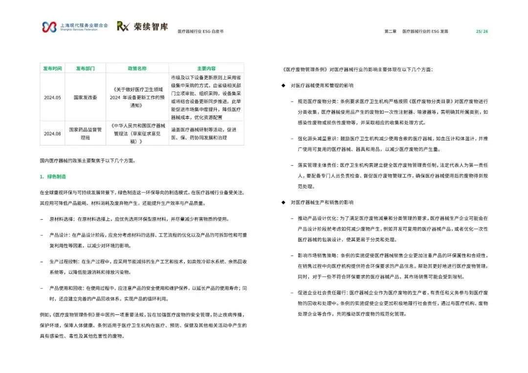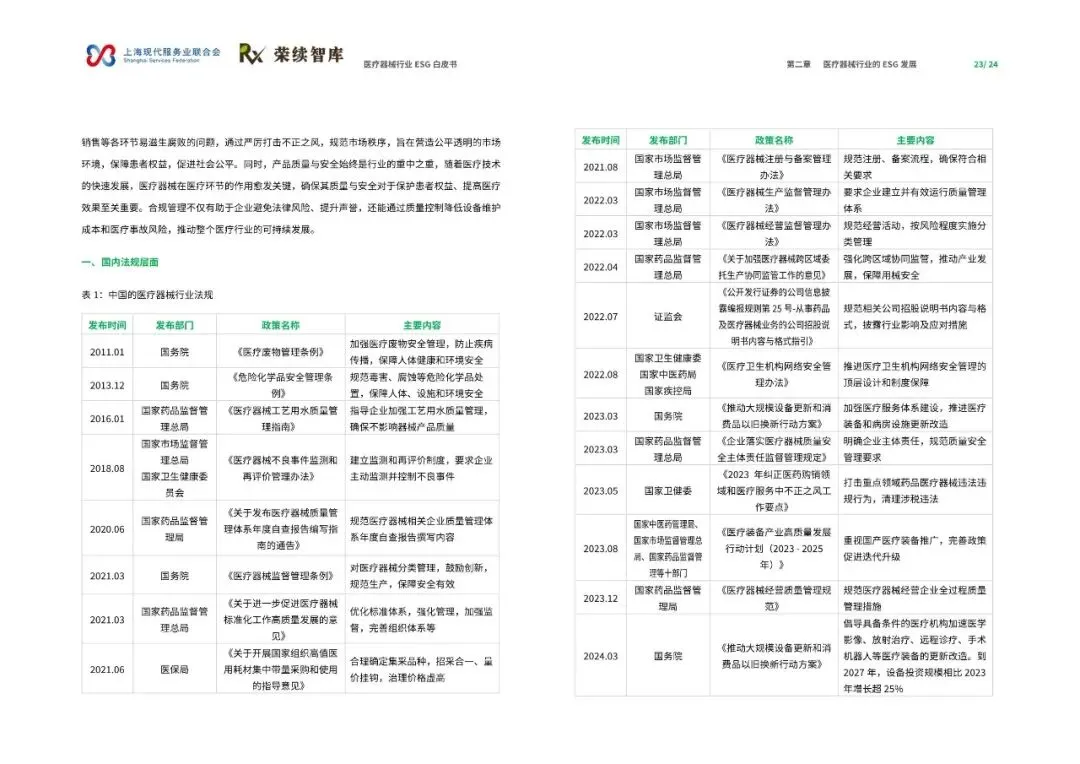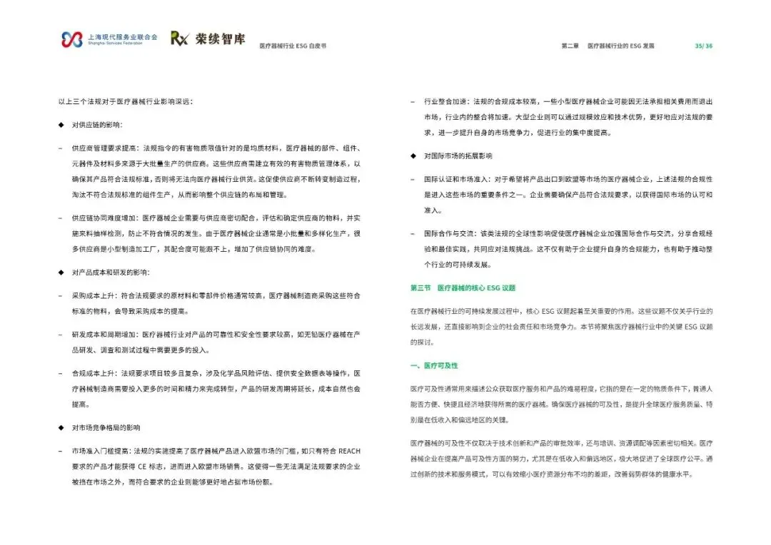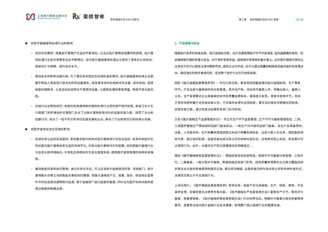 《医疗器械行业ESG白皮书》由上海现代服务业联合会与荣续智库联合发布,聚焦医疗器械行业在环境、社会和公司治理(ESG)领域的发展与实践。报告深入剖析了行业在政策、技术与全球供应链变革背景下的成长轨迹,旨在推动行业深入理解并积极践行ESG理念,实现可持续发展。