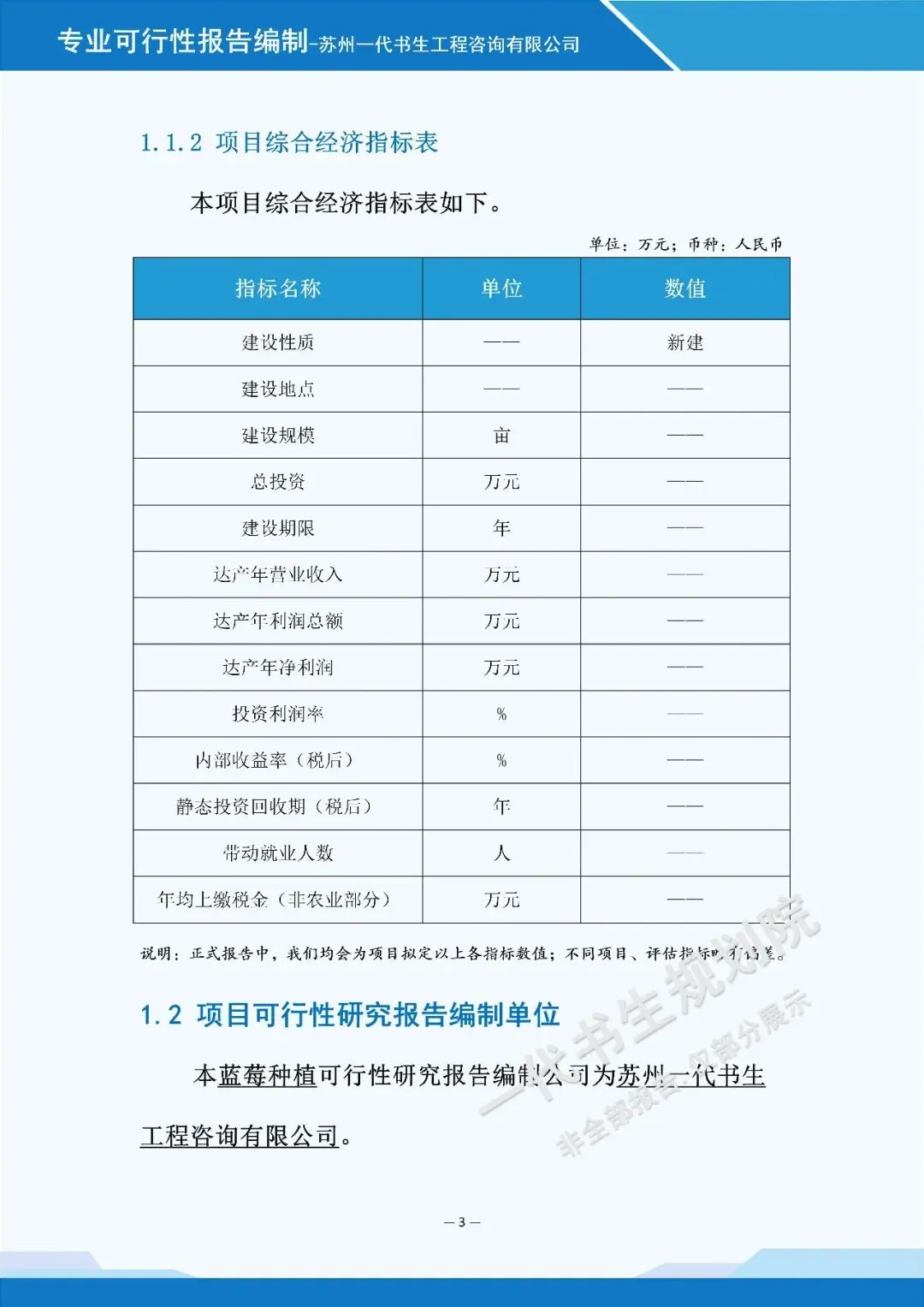 以下是《蓝莓种植基地项目可行性报告》的案例展示,该项目可行性报告出具公司为苏州一代书生工程咨询有限公司。项目可行性研究报告编写、项目计划书编写,请联系:17312436919。分析国内蓝莓市场需求、消费升级趋势、区域竞争格局及销售渠道,明确目标市场与定价策略。结合乡村振兴、现代农业、特色农林产业扶持政策,梳理用地、补贴、税收、金融等支持条件,论证项目政策合规性与申报可行性。围绕基地选址、土壤条件、水源保障、交通配套开展论证,确定种植规模与品种选型。明确土壤改良、水肥一体化、绿色防控、智能管护、采后处理等技术方案,规划基地道路、灌溉、仓储、分拣等基础设施,确保项目可落地、可运营。测算项目总投资、运营成本、营业收入及利税效益,评估投资回收期、财务内部收益率等指标。识别自然风险、市场价格波动、病虫害等潜在风险,制定防控、保险、订单农业等应对措施,保障项目经济可持续。本可行性报告由苏州一代书生工程咨询有限公司专业编制,我们专注项目可行性研究、项目计划书、规划设计等全流程咨询服务,覆盖农业、工业、文旅、基建、乡村振兴等多领域,具备规范编制、数据严谨、逻辑清晰、贴合申报要求的专业优势,为项目立项、融资、落地提供高质量支撑。产业规划咨询、概念规划设计