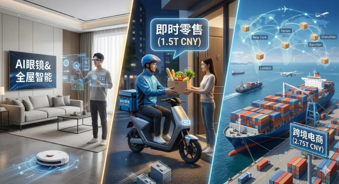 即时零售重塑履约:将“外卖”逻辑延伸至全品类。据商务部估算,2025年即时零售市场规模攀升至1.5万亿元,年均复合增长率约25%。