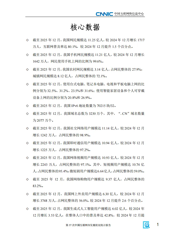 《第57次中国互联网络发展状况统计报告》展现了2025年我国互联网发展的整体面貌,作为“十四五”规划收官之年,我国互联网基础资源持续完善,数实融合深度推进,人工智能全面赋能各领域,互联网发展成果普惠性不断提升。