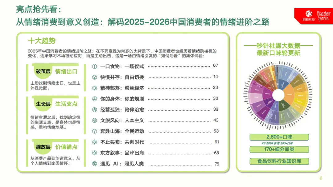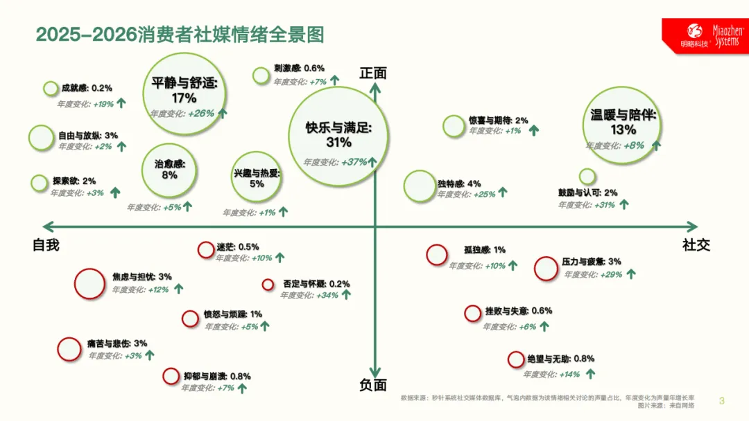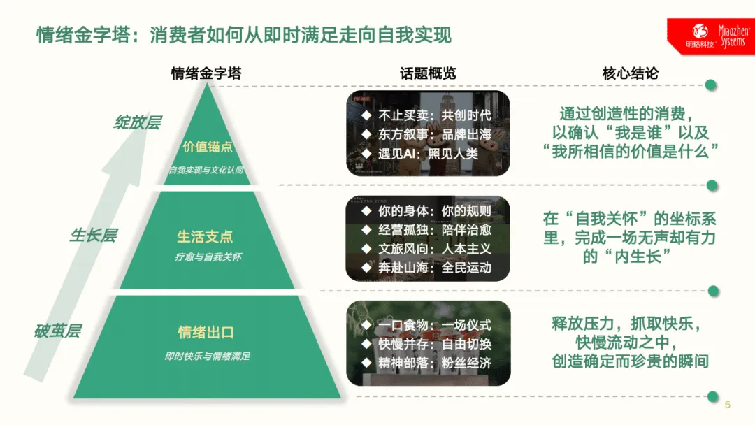 报告显示,消费者社媒情绪中正面情绪占主导,快乐与满足、平静与舒适等情绪声量及年增长率显著,同时负面情绪也有不同程度上升,情绪成为消费决策的核心驱动力,消费者形成从即时快乐满足的破茧层、疗愈自我关怀的生长层到自我实现文化认同的绽放层的情绪金字塔。