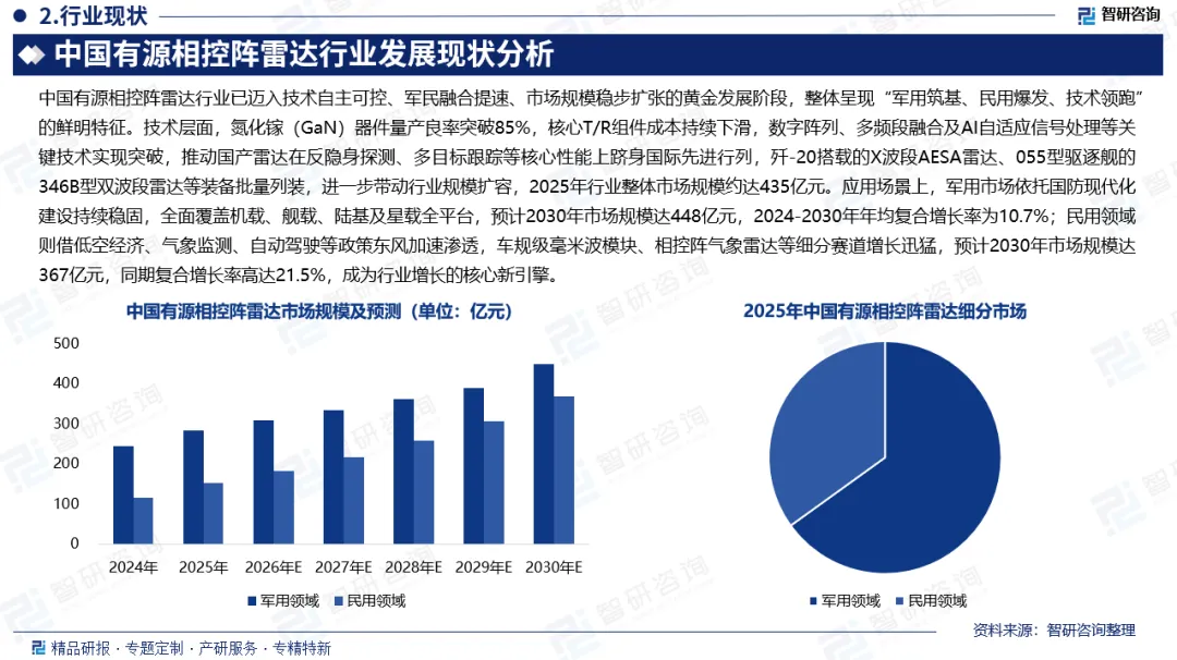 中国有源相控阵雷达行业已迈入技术自主可控、军民融合提速、市场规模稳步扩张的黄金发展阶段,整体呈现“军用筑基、民用爆发、技术领跑”的鲜明特征。技术层面,氮化镓(GaN)器件量产良率突破85%,核心T/R组件成本持续下滑,数字阵列、多频段融合及AI自适应信号处理等关键技术实现突破,推动国产雷达在反隐身探测、多目标跟踪等核心性能上跻身国际先进行列,歼-20搭载的X波段AESA雷达、055型驱逐舰的346B型双波段雷达等装备批量列装,进一步带动行业规模扩容,2025年行业整体市场规模约达435亿元。应用场景上,军用市场依托国防现代化建设持续稳固,全面覆盖机载、舰载、陆基及星载全平台,预计2030年市场规模达448亿元,2024-2030年年均复合增长率为10.7%;民用领域则借低空经济、气象监测、自动驾驶等政策东风加速渗透,车规级毫米波模块、相控阵气象雷达等细分赛道增长迅猛,预计2030年市场规模达367亿元,同期复合增长率高达21.5%,成为行业增长的核心新引擎。