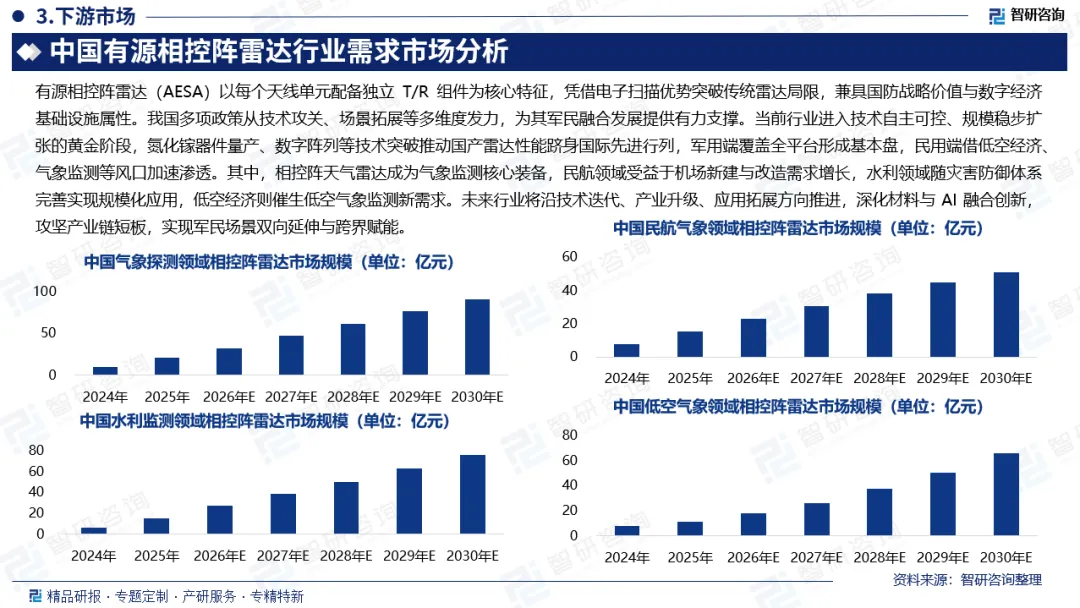有源相控阵雷达以独立T/R组件为核心,突破传统雷达局限,兼具无惯性扫描、多目标跟踪等优势,是国防安全基石与数字经济关键基础设施。我国出台多项政策,从多维度推动其技术迭代与民用落地,加速其向民用经济渗透。当前行业呈现“军用筑基、民用爆发、技术领跑”特征,技术上氮化镓器件量产、成本下滑,关键技术突破,国产雷达性能国际领先,带动规模扩容,2025年约达435亿元。应用上,军用市场稳固,民用借政策东风加速渗透,2030年民用市场规模预计达367亿元。有源相控阵天气雷达是气象监测核心装备,我国气象灾害频发,政策推动下,气象探测领域相控阵雷达市场高速增长,2030年预计达90.02亿元。此外,民航、水利、低空气象等领域需求旺盛,市场增长动力强劲。未来,行业将沿技术迭代、产业升级与应用拓展推进,形成良性发展态势。