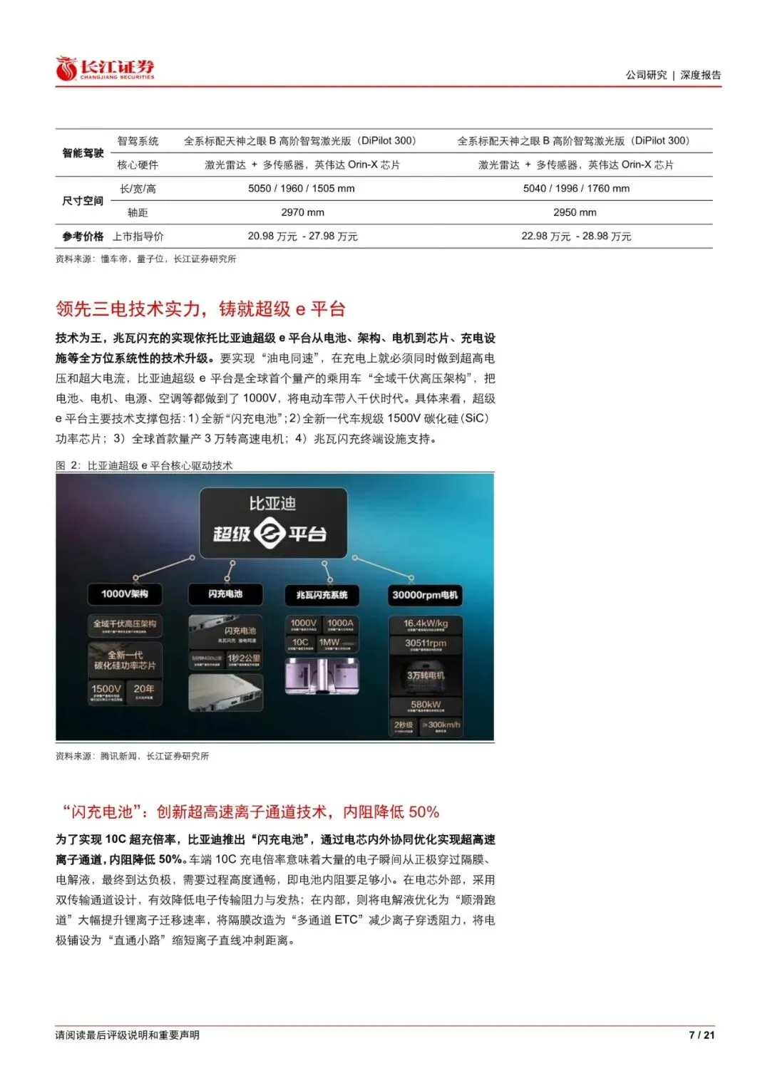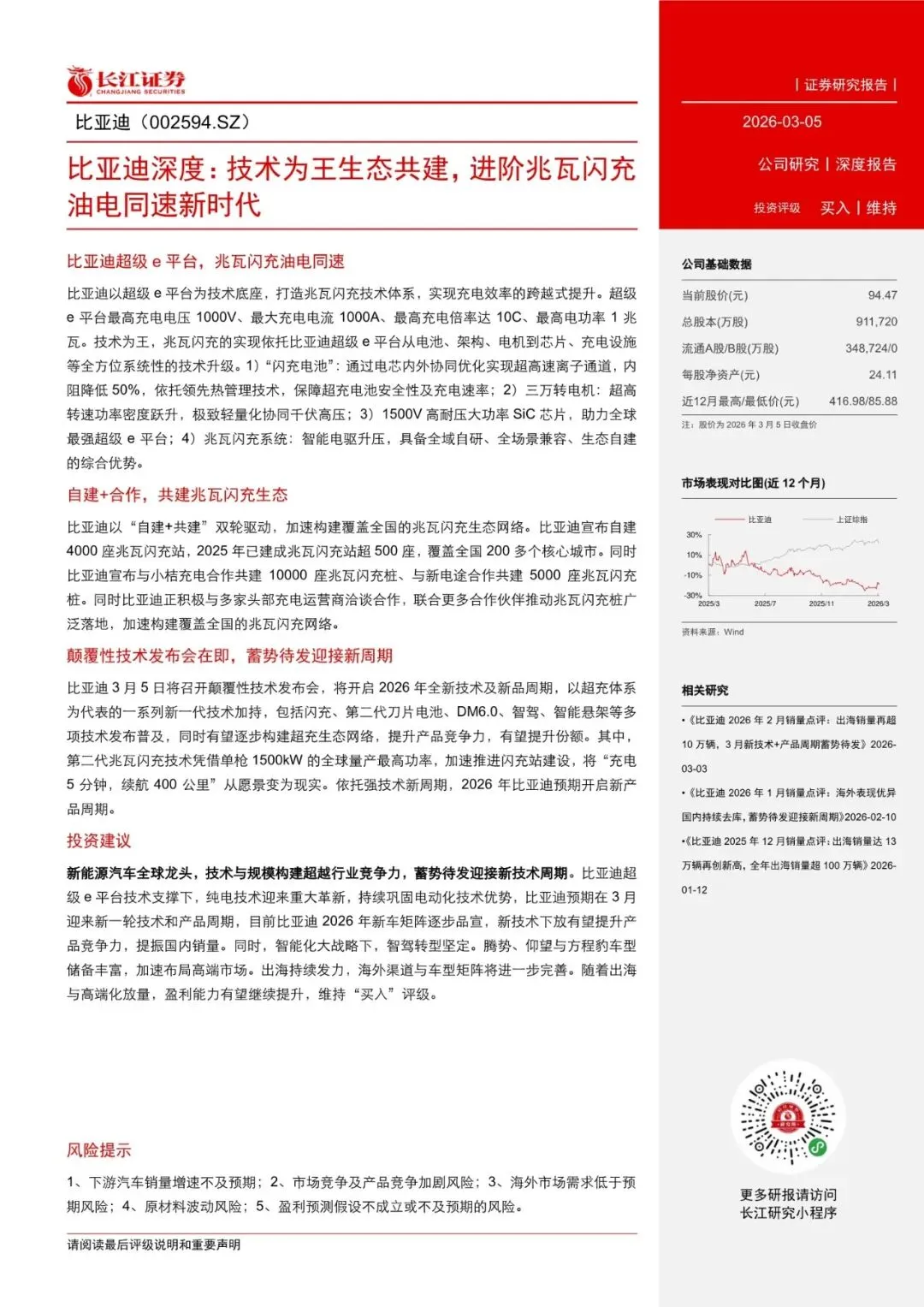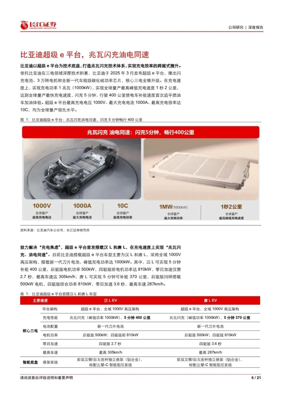 比亚迪以超级e台为技术底座,打造兆瓦闪充技术体系,实现充电效率的跨越式提升。超级e平台最高充电电压1000V、最大充电电流1000A、最高充电倍率达10C、最高电功率1兆瓦。技术为王,兆瓦闪充的实现依托比亚迪超级e平台从电池、架构、电机到芯片、充电设施等全方位系统性的技术升级。比亚迪3月5日将召开颠覆性技术发布会,将开启2026年全新技术及新品周期,以超充体系为代表的一系列新一代技术加持,同时有望逐步构建超充生态网络,提升产品竞争力,有望提升份额。