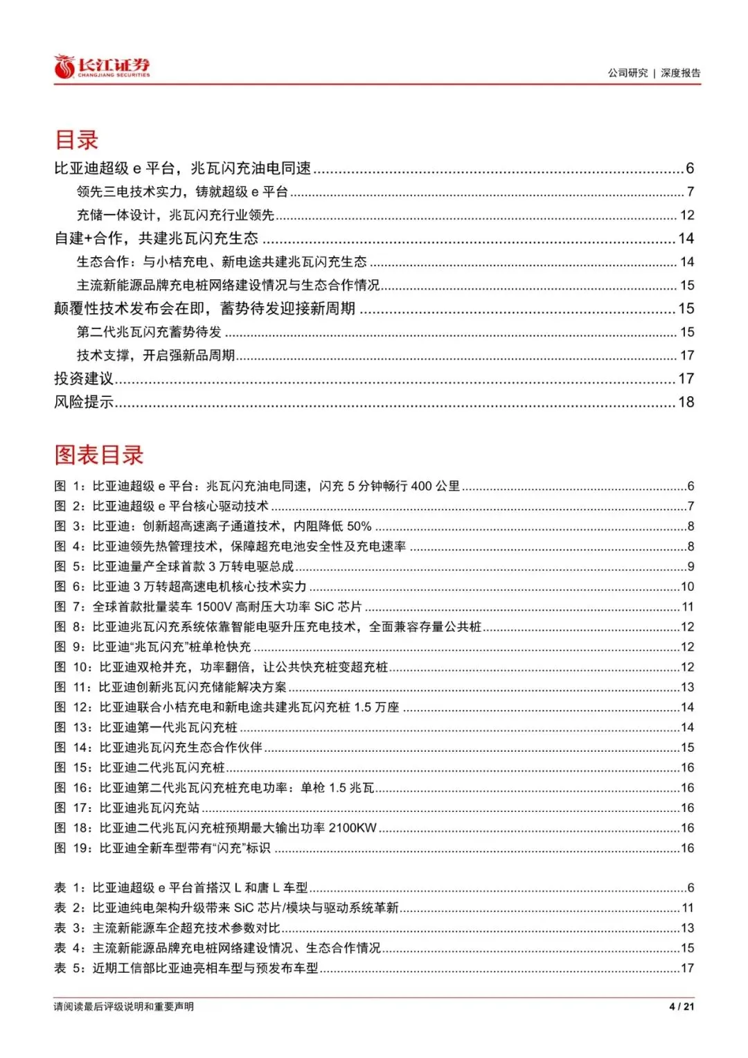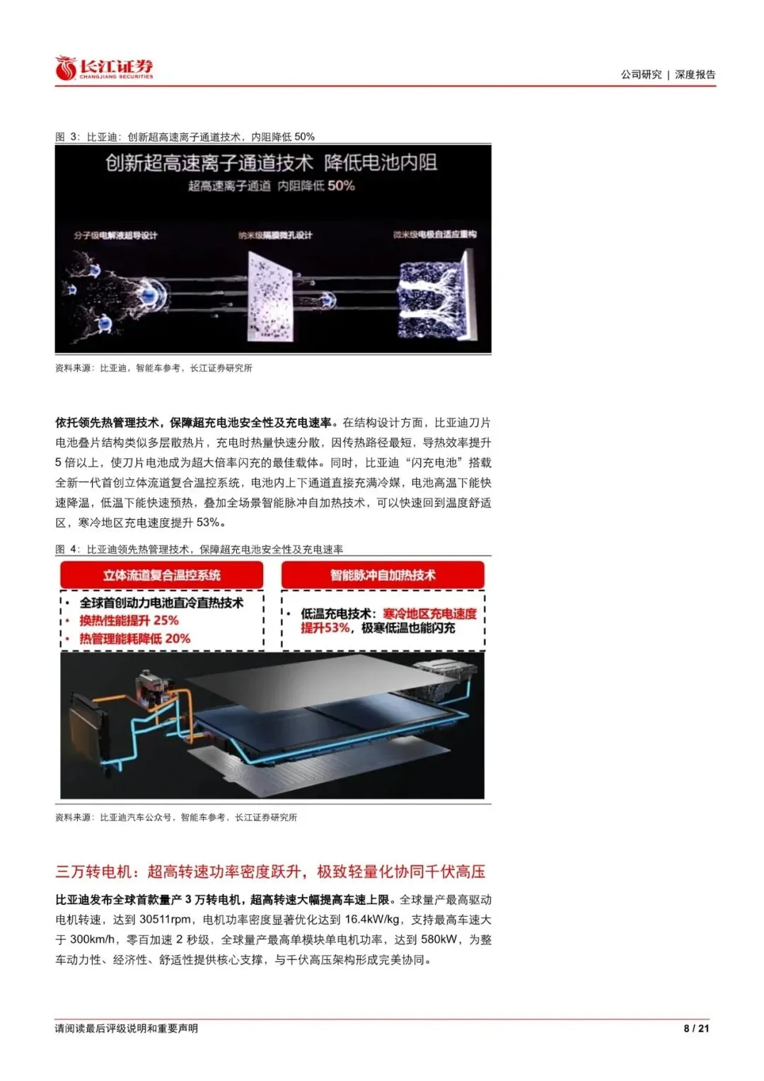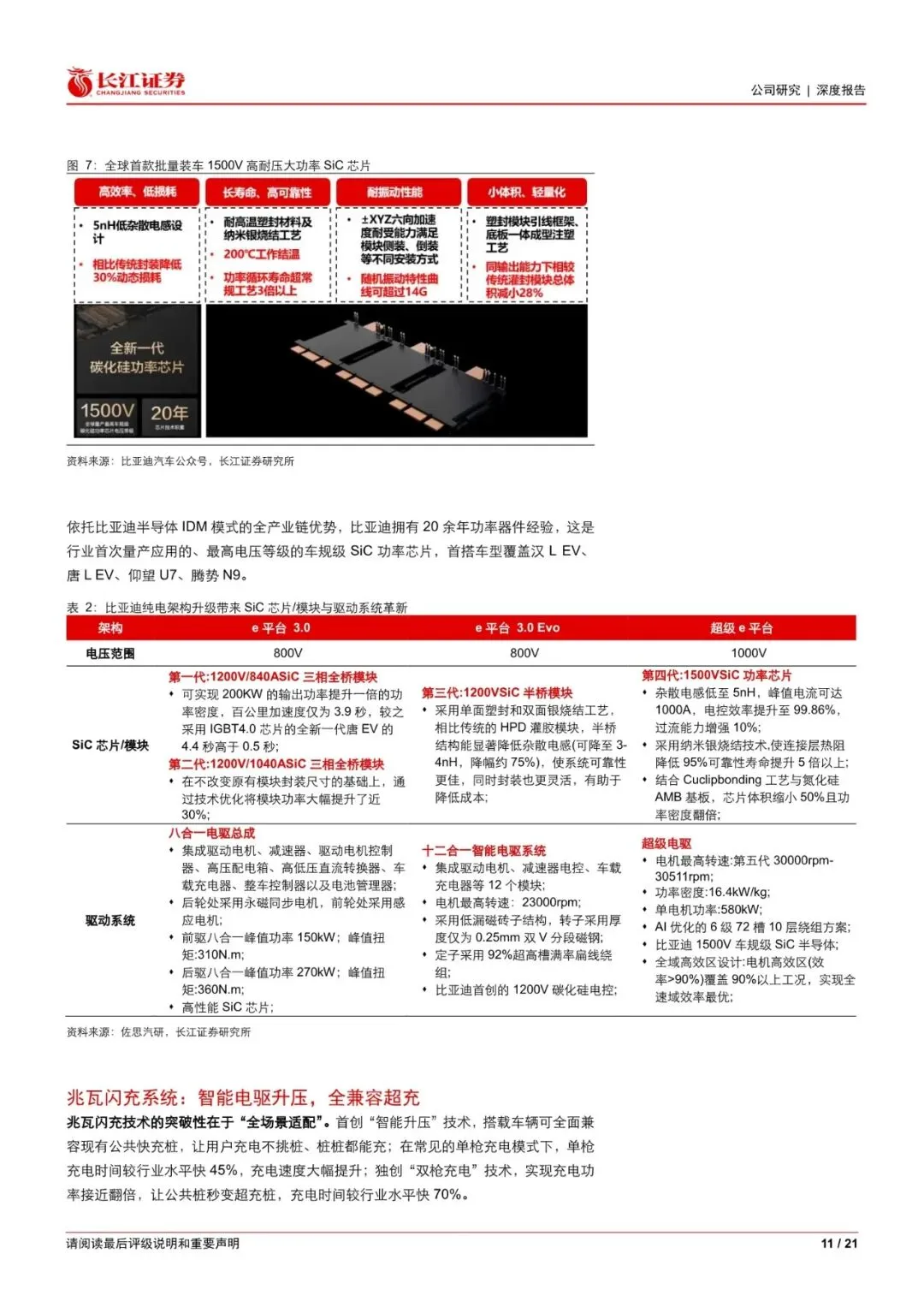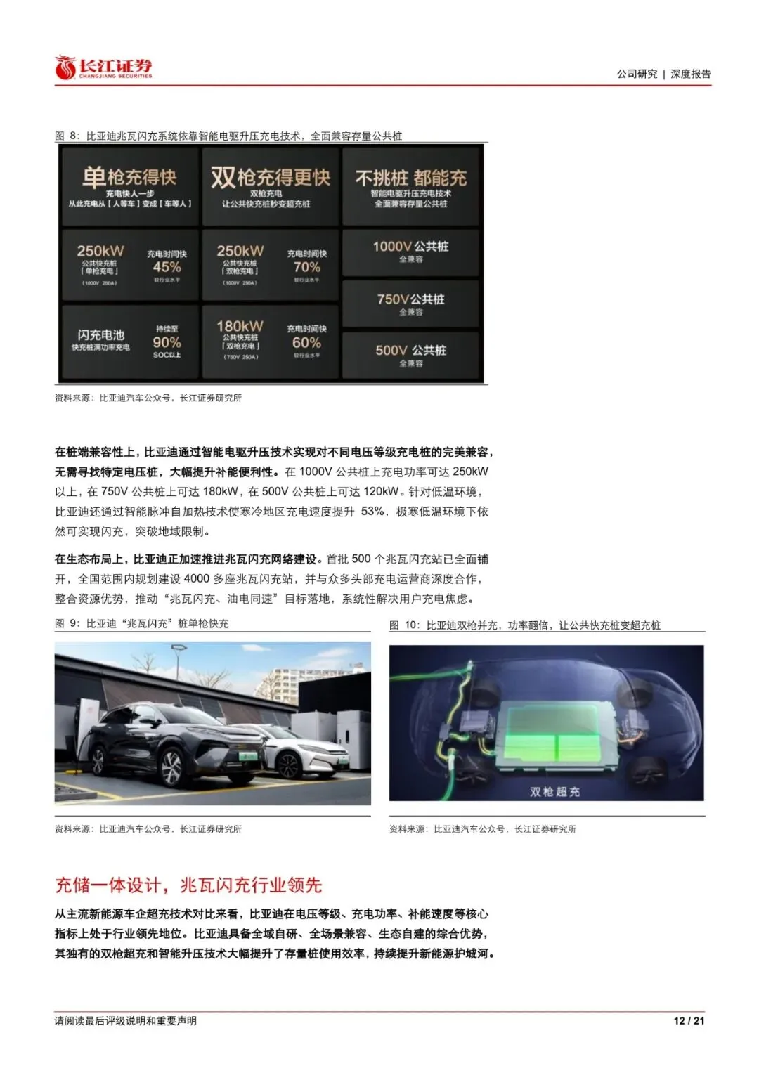 比亚迪以超级e台为技术底座,打造兆瓦闪充技术体系,实现充电效率的跨越式提升。超级e平台最高充电电压1000V、最大充电电流1000A、最高充电倍率达10C、最高电功率1兆瓦。技术为王,兆瓦闪充的实现依托比亚迪超级e平台从电池、架构、电机到芯片、充电设施等全方位系统性的技术升级。比亚迪3月5日将召开颠覆性技术发布会,将开启2026年全新技术及新品周期,以超充体系为代表的一系列新一代技术加持,同时有望逐步构建超充生态网络,提升产品竞争力,有望提升份额。