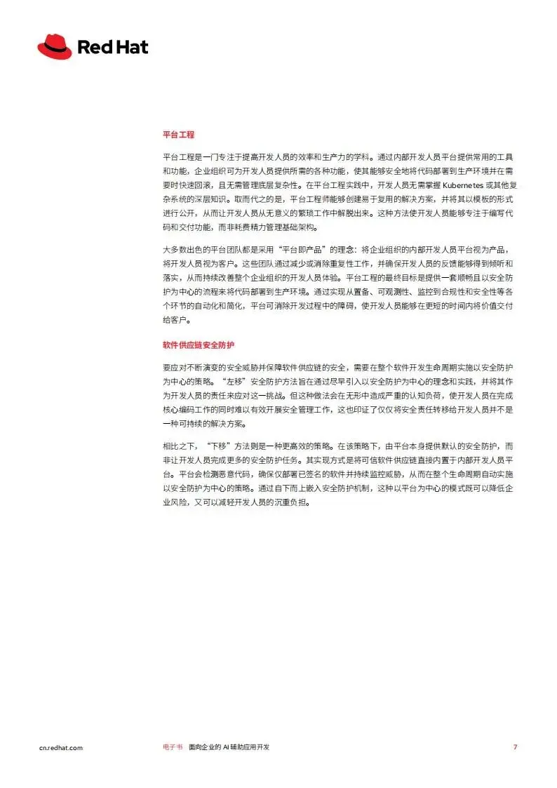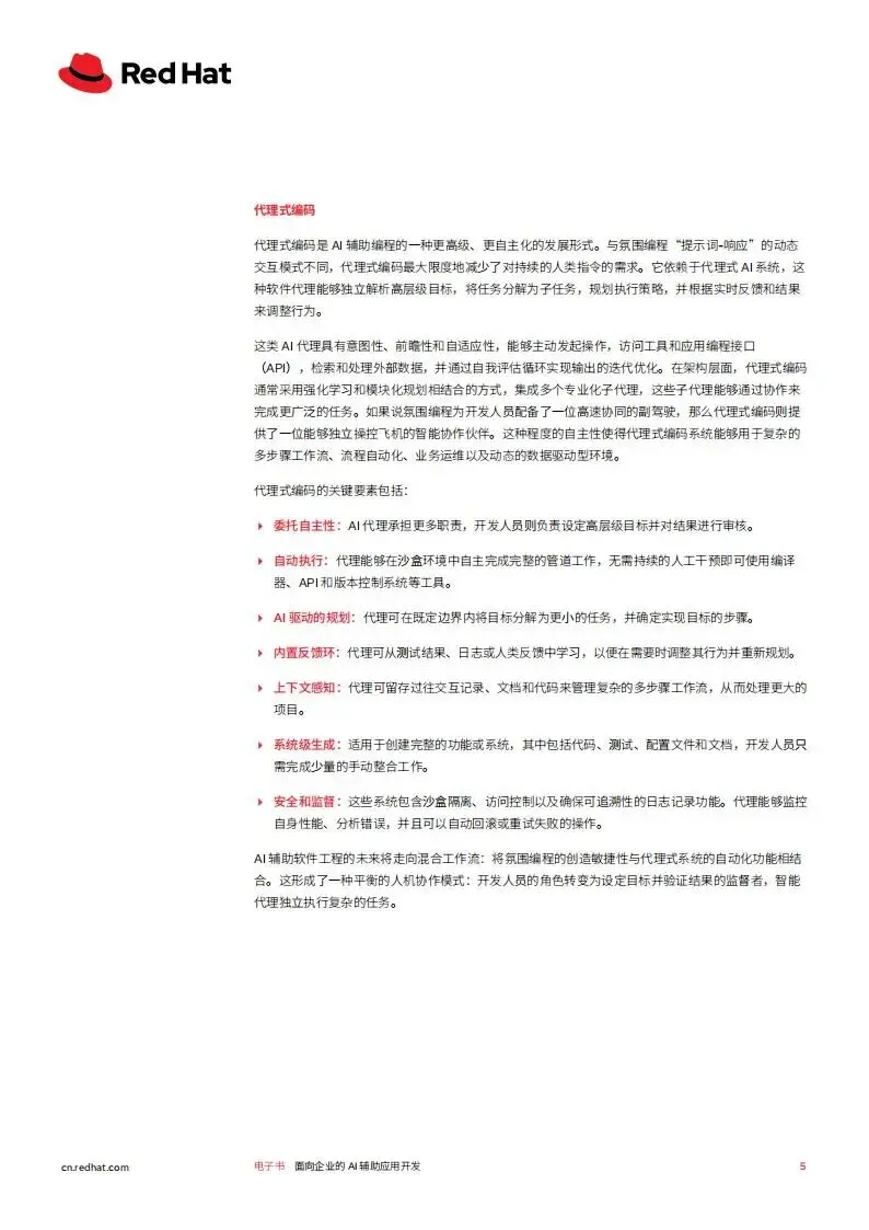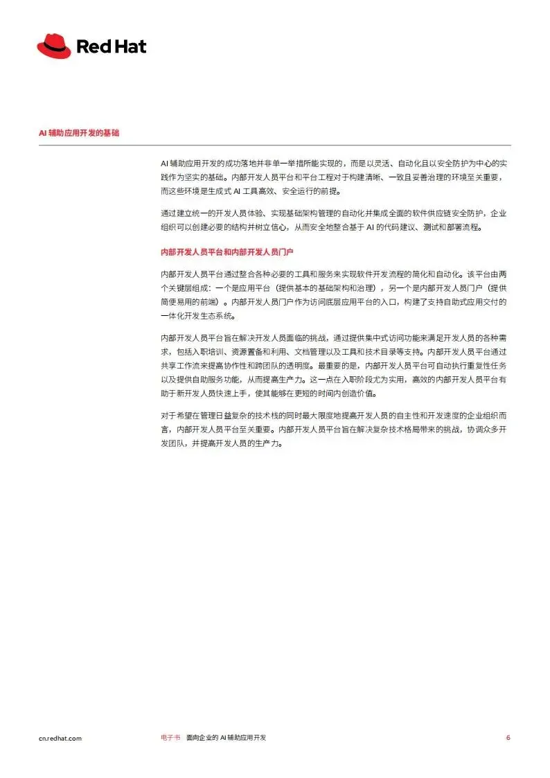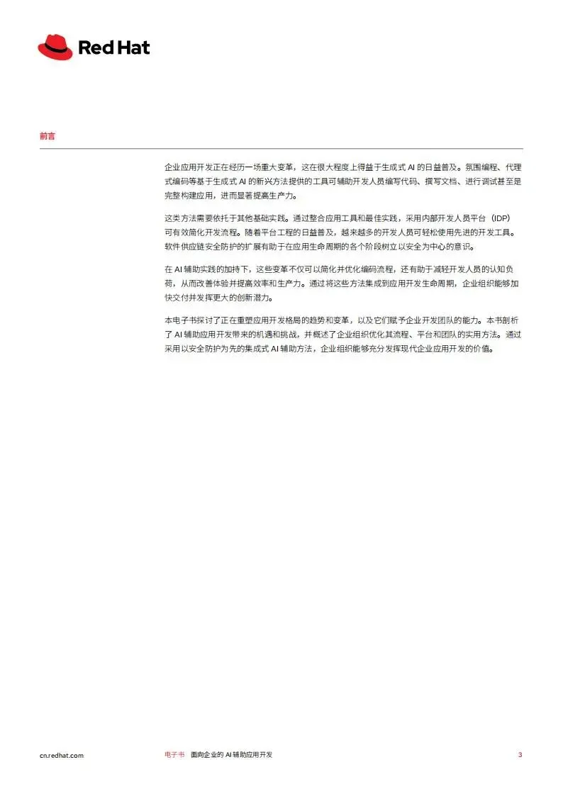 红帽2026年面向企业的AI辅助应用开发白皮书,聚焦生成式AI驱动下企业应用开发的变革,阐述了AI辅助开发的核心模式、落地基础、面临挑战及实施路径,并介绍了红帽对应的解决方案,核心是通过平台工程等实践,让企业安全高效地实现AI辅助开发的规模化落地,提升开发人员生产力与企业创新能力。