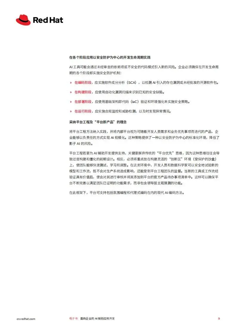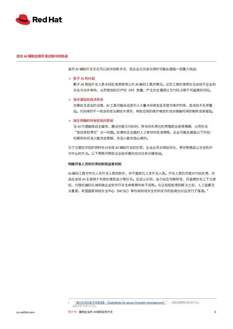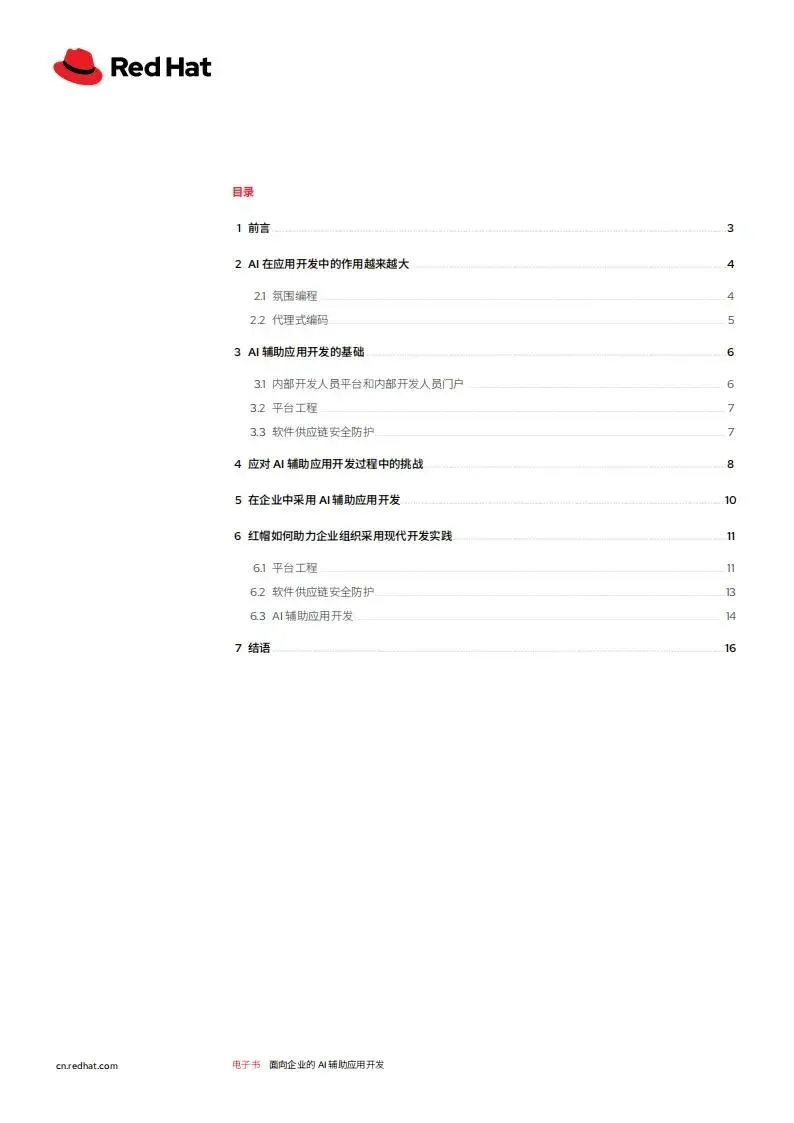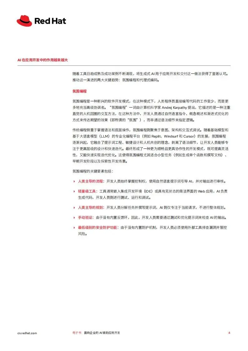 红帽2026年面向企业的AI辅助应用开发白皮书,聚焦生成式AI驱动下企业应用开发的变革,阐述了AI辅助开发的核心模式、落地基础、面临挑战及实施路径,并介绍了红帽对应的解决方案,核心是通过平台工程等实践,让企业安全高效地实现AI辅助开发的规模化落地,提升开发人员生产力与企业创新能力。