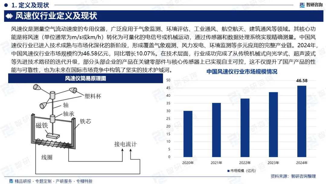 市场规模:中国风速仪行业已进入技术成熟与市场化深化的新阶段,形成覆盖气象观测、风力发电、环境监测等多元应用的完整产业链。2024年,中国风速仪行业市场规模约为46.58亿元,同比增长10.07%。在技术层面,行业成功完成了从传统机械式向光学式、超声波式等先进技术路径的迭代升级,部分头部企业的产品在关键零部件与核心传感器上已实现自主可控,这不仅提升了国产产品的性能与可靠性,也为未来在国际市场竞争中构筑了坚实的技术护城河。