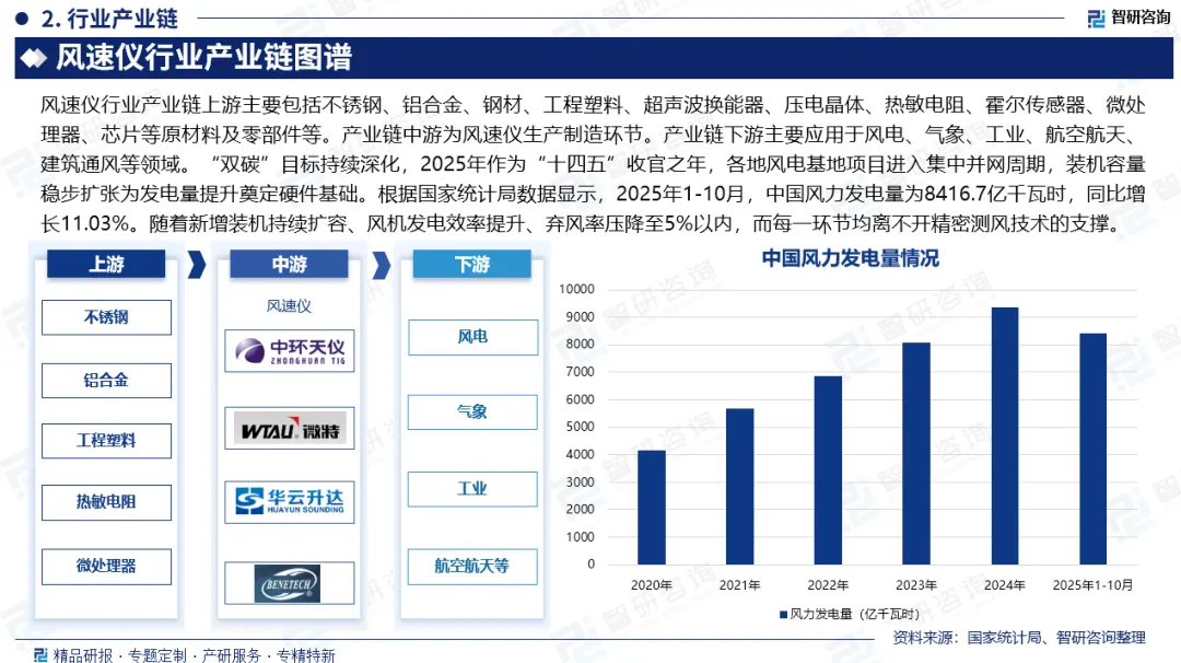 产业链核心节点:“双碳”目标持续深化,2025年作为“十四五”收官之年,各地风电基地项目进入集中并网周期,装机容量稳步扩张为发电量提升奠定硬件基础。根据国家统计局数据显示,2025年1-10月,中国风力发电量为8416.7亿千瓦时,同比增长11.03%。随着新增装机持续扩容、风机发电效率提升、弃风率压降至5%以内,而每一环节均离不开精密测风技术的支撑。