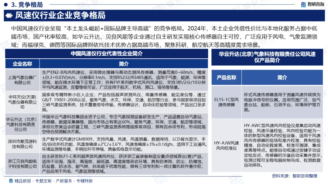 竞争情况:中国风速仪行业呈现“本土龙头崛起+国际品牌主导高端”的竞争格局。2024年,本土企业凭借性价比与本地化服务占据中低端市场,国产化率较高,如华云升达、贝良风能等企业通过自主研发实现核心传感器自主可控,广泛应用于风电、气象监测领域;而福禄克、德图等国际品牌则依托技术优势占据高端市场,聚焦科研、航空航天等高精度需求场景。