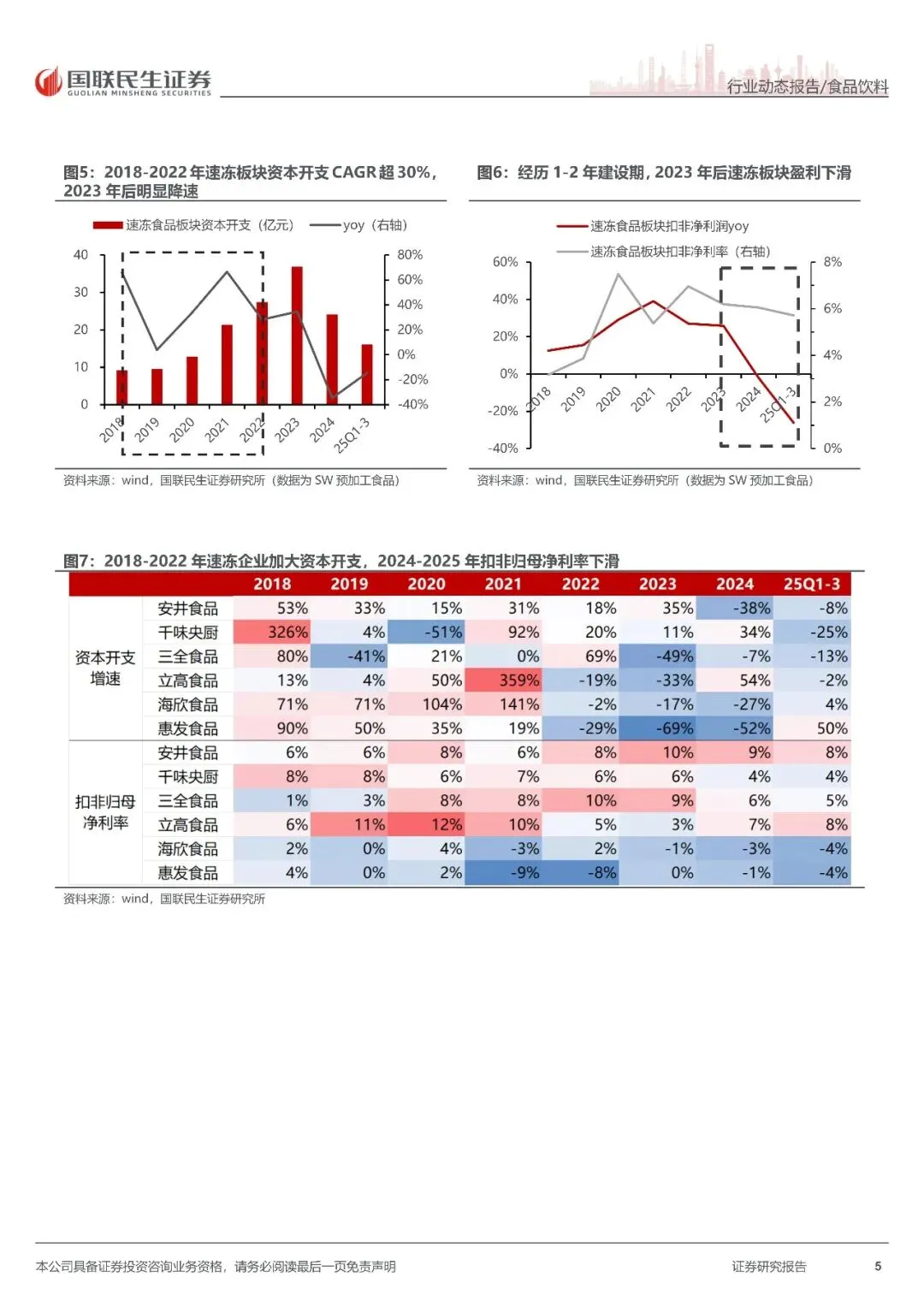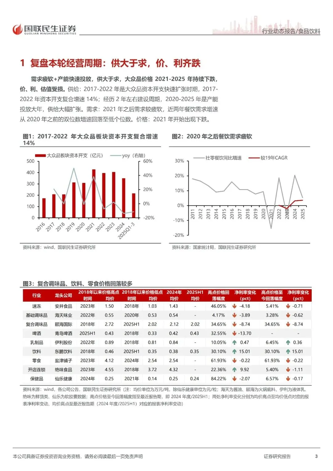 需求疲软+产能快速投放,供大于求,大众品价格 2021-2025 年持续下跌,价、利、估值受损。供给:2017-2022 年是大众品资本开支快速扩张时期,2017-2022年资本开支复合增速 14%;经历 2 年左右建设周期,2020-2025 年是产能投放大年,供给大幅扩张。需求:2021 年之后需求较疲软,近两年餐饮需求增速从2020 年之前的双位数增速回落至低个位数。价格:2021 年开始持续下跌,大众品龙头企业出厂均价高点至今普遍回落。