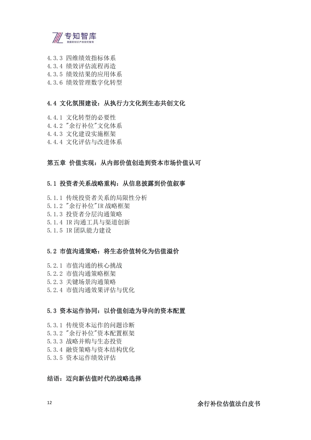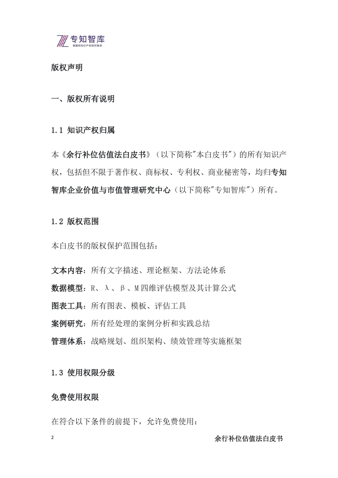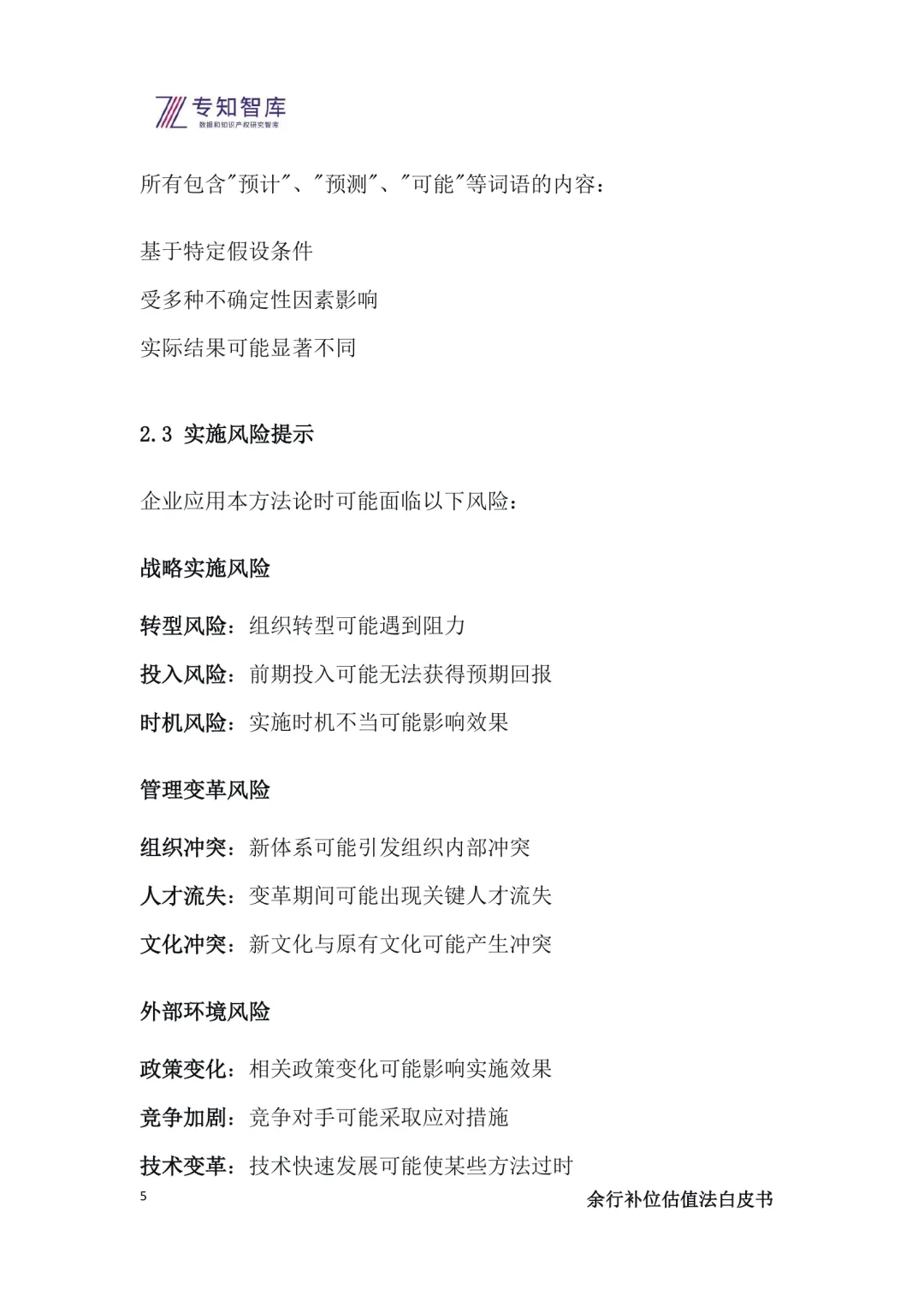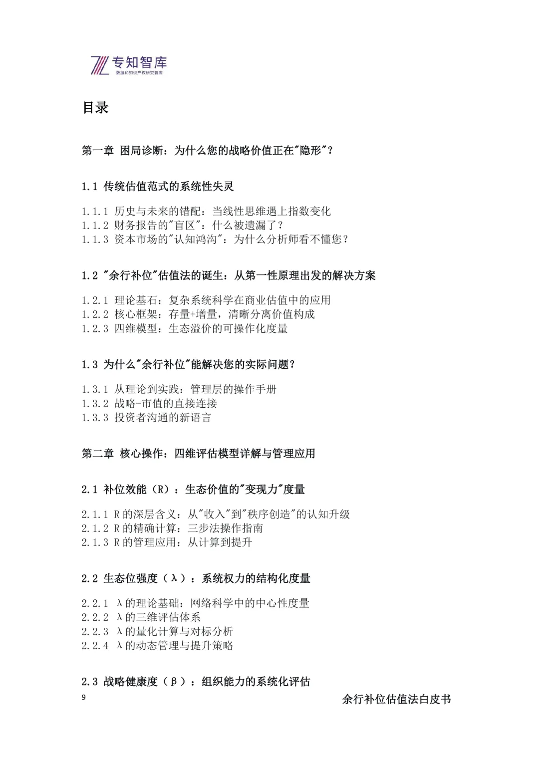 余行补位估值法是一种将企业生态战略转化为市值优势的系统性方法,旨在帮助上市公司管理层实现价值提升。该方法以四个核心维度构建评估模型:R(资源)、λ(链接)、β(反馈)、M(市场),通过量化分析和动态调整,支持企业在复杂市场环境中优化资源配置、增强协同效应,并提升整体竞争力。白皮书强调,该估值法属于方法论框架,不构成投资建议或操作指南,需结合实际情况进行本地化适配。其应用过程中可能面临战略转型、管理变革及外部环境等多方面风险,企业应根据自身条件谨慎实施,并在专业指导下持续优化。内容涵盖理论体系、数据模型、图表工具、案例研究及管理体系,适用于企业内部研讨、学术研究及媒体报道等非商业用途,但需注明来源并保持完整性。如用于商业目的,需向专知智库申请授权。